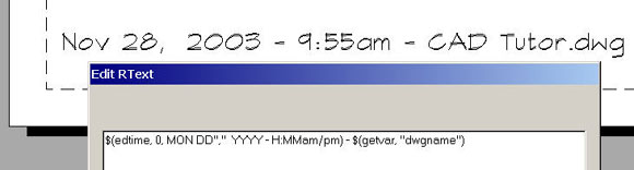 To display the current Date, Time and File name in the drawing, put this in the Edit Rtext box: