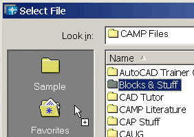 The Power Tool for this month looks at the "Places list" that now occurs in the A2000i/A2004 Select File dialog. But there are a couple squirrely things I discovered about this potentially powerful feature. First, you would think (intuitively) that you could drag a file from the list of drawings in the dialog into the Favorites folder, for example. Nope. You have to use the Tools/Add to Favorites menu selection.