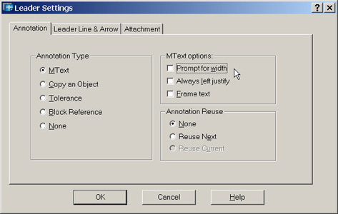Click OK to close the dialog, then place the arrowhead position, the second point of the leader spline, then the final point where the text will be located. You are then prompted to enter the first line of text, but if you press <Enter>, the Mtext dialog opens.