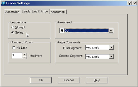 Another nice feature in the Leader Settings dialog is the Leader Line & Arrow tab which has a Spline option. I usually leave the Number of Points setting on 3.