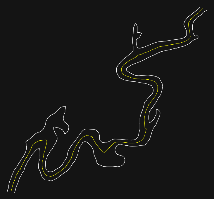 I'm interested in where this topic will be going with the different "side quests" like islands and inlets. In the mean time I kept going, trying to fix my version and after a lot of testing/debugging I changed to code again. Now it is working as expected on all of the examples I have found! ;| ; Calculate centerline between two polylines - dexus ; Function checks intersections of the offsets of two lines to create a middle/avarage line. ; https://www.cadtutor.net/forum/topic/98778-hybrid-parallel/page/7/#findComment-677877 ; Version / Date - Change ; 0.01 [19-11-2025] - Initial release ; 0.02 [27-11-2025] - Added corner support on negative side of crossing polylines ; 0.03 [28-11-2025] - Extra check using vertex to closest point as distance ; 0.04 [28-11-2025] - Added error function ; 0.05 [01-12-2025] - Improved distance check to prevent zigzag lines ; 0.06 [01-12-2025] - Check if offset can be used before adding points ; 0.07 [01-12-2025] - Improved side check on 3 points ; 0.08 [04-12-2025] - Don't compare startpoint to offset when eiter of the polylines is closed ; 0.09 [05-12-2025] - Add points for parallel end segments ; 0.10 [18-12-2025] - More checks for deleting lines and added dedicated function ; 0.11 [08-01-2026] - Support for multiple output lines of the offset function ; 0.12 [08-01-2026] - Bulges are transformed to lines to handle cocentric arcs ; 0.13 [08-01-2026] - Rewrote the _avarageAngle and _diffAngle function |; (defun c:cl (/ corners ent1 ent2 gap index loop maxlen offset offsetdistance org1 org2 parallel pts sides ss start te0 te1 te2 tmp1 tmp2 LM:ProjectPointToLine LM:intersections _addPoints _avarageAngle _checkOffset _checkSortDirection _copyPolyline _cornerOffset _deleteTmpLine _diffAngle _doOffset _getAnglesAtParam _polyline _side *error*) (defun *error* (st) (if (wcmatch (strcase st t) "*break,*cancel*,*exit*") (redraw) (princ (strcat "\nOops! Something went wrong: ") st) ) (mapcar '_deleteTmpLine (list ent1 ent2 te0 te1 te2)) (princ) ) ;| ; Deletes an object or list of objects ; @Param obj vla-object or list |; (defun _deleteTmpLine (obj) (cond ((null obj)) ((vl-catch-all-error-p obj)) ((= (type obj) 'list) (mapcar '_deleteTmpLine obj)) ((not (vlax-erased-p obj)) (vla-delete obj)) ) ) ;| ; Draw Polyline - dexus ; Draw a polyline from a list of points, but filter out colinear points ; @Param lst list of points ; @Returns ename of polyline |; (defun _polyline (lst closed / prev pts) (while lst (cond ( (and (cdr lst) prev (or (equal (cdr lst) prev 1e-8) ; Remove duplicate points (null (inters prev (car lst) prev (cadr lst))) ; Remove collineair points ) ) ) ((setq pts (cons (cons 10 (setq prev (car lst))) pts))) ) (setq lst (cdr lst)) ) (entmakex (append (list (cons 0 "LWPOLYLINE") (cons 100 "AcDbEntity") (cons 100 "AcDbPolyline") (cons 90 (length pts)) (cons 8 (getvar 'clayer)) (cons 70 (if closed 1 0)) ) (reverse pts) ) ) ) (defun _copyPolyline (ent maxlen closed rev / bul pts index curve steps size next) (setq ent (vlax-ename->vla-object ent) index 0) (repeat (1+ (fix (vlax-curve-getEndParam ent))) (cond ( (and (not (vl-catch-all-error-p (setq bul (vl-catch-all-apply 'vla-getbulge (list ent index))))) (not (equal bul 0.0 1e-8)) (setq next (vlax-curve-getDistAtParam ent (1+ index))) (not (zerop (setq steps (fix (* (/ (- next (vlax-curve-getDistAtParam ent index)) maxlen) 45))))) ) (setq size (/ 1.0 steps) curve index) (repeat steps (setq pts (cons (vlax-curve-getPointAtParam ent curve) pts) curve (+ curve size)) ) ) ((setq pts (cons (vlax-curve-getPointAtParam ent index) pts))) ) (setq index (1+ index)) ) (_polyline (if rev (reverse pts) pts) closed) ) (defun _side (pline pnt / cpt end target der) ; https://www.theswamp.org/index.php?topic=55685.msg610429#msg610429 (setq cpt (vlax-curve-getClosestPointTo pline pnt) end (vlax-curve-getEndParam pline) target (vlax-curve-getParamAtPoint pline cpt) der (if (and (equal target (fix target) 1e-8) (or (vlax-curve-isClosed pline) (and (not (equal (vlax-curve-getStartParam pline) target 1e-8)) (not (equal end target 1e-8))) ) ) (mapcar '- (polar cpt (angle '(0 0) (vlax-curve-getFirstDeriv pline (rem (+ target 1e-3) end))) 1.0) (polar cpt (angle (vlax-curve-getFirstDeriv pline (rem (+ (- target 1e-3) end) end)) '(0 0)) 1.0) ) (vlax-curve-getFirstDeriv pline target) ) ) (minusp (sin (- (angle cpt pnt) (angle '(0.0 0.0) der)))) ) ;; Intersections - Lee Mac ;; mod - [int] acextendoption enum of intersectwith method (defun LM:intersections ( ob1 ob2 mod / lst rtn ) (if (and (vlax-method-applicable-p ob1 'intersectwith) (vlax-method-applicable-p ob2 'intersectwith) (setq lst (vlax-invoke ob1 'intersectwith ob2 mod)) ) (repeat (/ (length lst) 3) (setq rtn (cons (list (car lst) (cadr lst) (caddr lst)) rtn) lst (cdddr lst)) ) ) (reverse rtn) ) (defun _doOffset (offset / lst rtn) ; Global vars: pts ent1 ent2 sides te1 te2 (setq rtn (cond ((equal offset 0.0 1e-8) (if (setq lst (LM:intersections ent1 ent2 acExtendNone)) (setq pts (_addPoints lst ent1 ent2 pts)) ) lst ) ( (or ; Make offset (setq te1 nil) (vl-catch-all-error-p (setq te1 (vl-catch-all-apply 'vlax-invoke (list ent1 'Offset (if (car sides) offset (- offset)))))) (not (setq tmp1 (vl-some (function (lambda (te) (_checkOffset ent1 te offset))) te1))) (vla-put-visible tmp1 :vlax-false) ; (vla-put-color tmp1 252) (setq te2 nil) (vl-catch-all-error-p (setq te2 (vl-catch-all-apply 'vlax-invoke (list ent2 'Offset (if (cadr sides) offset (- offset)))))) (not (setq tmp2 (vl-some (function (lambda (te) (_checkOffset ent2 te offset))) te2))) (vla-put-visible tmp2 :vlax-false) ; (vla-put-color tmp2 252) ) (princ (strcat "\nOffset of " (rtos offset 2 4) " failed. ")) nil ) ((setq lst (LM:intersections tmp1 tmp2 acExtendNone)) (if parallel ; Add points of parallel end segments (mapcar (function (lambda (ent1 ent2) (mapcar (function (lambda (pt) (if (equal pt (vlax-curve-getClosestPointTo ent2 pt) 1e-10) (setq lst (cons pt lst)) ) )) (list (vlax-curve-getStartPoint ent1) (vlax-curve-