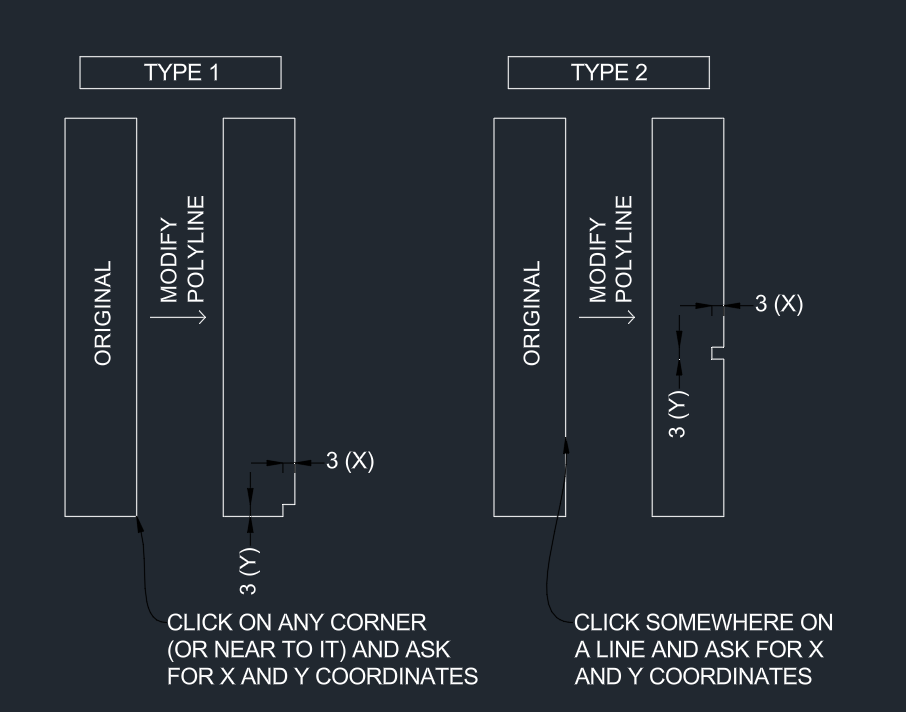 Hi all, Long story short, I waste tens of hours per year creating "quirks" in polylines, and I'm hoping that this could be automated using a LISP....problem is I have no idea where to start when it comes to manipulating geometry with LISP (or even if what I'm trying to achieve is possible). I'm wondering if anyone has a lisp, or could create a lisp (I will be eternally grateful) that can modify a polyline in a specific manner. The image below shows what I'm trying to achieve. I'd love to have 2 lisps. One to do corners (type 1 - calld "quirkc" ) and another to do lines (type 2 - called "quirkl"). The functionality I'd like to achieve in these LISPS is as follows; 1. Activate the lisp 2. Pick a point on the line or the corner (these geometries are polylines or closed polylines) 3. Have a prompt appear asking for width (x) and height (y) 4. modify the polyline as shown (create additional points in the polyline offset the required x and y distances) Thank you in advance for any help you can provide (or simply telling me this is not possible).