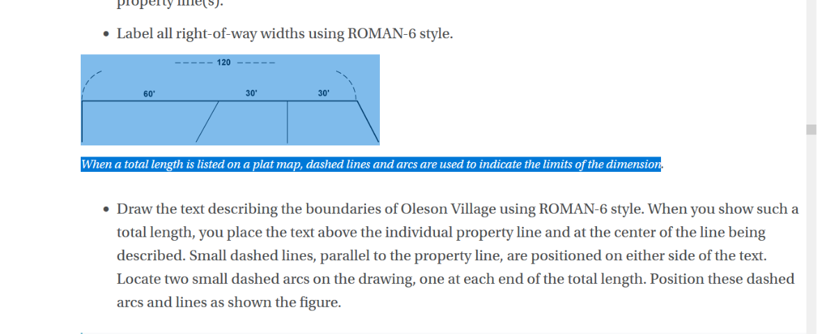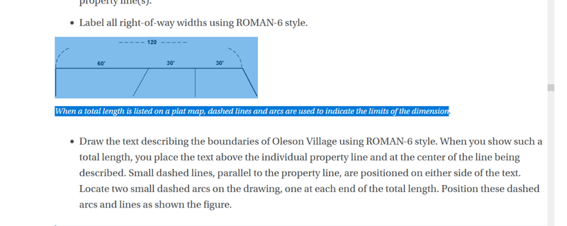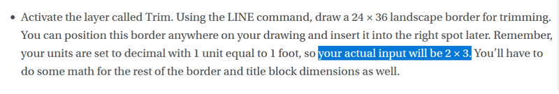 Hello, I'm at the final steps for this project and I'm stuck on 2 parts. First is the dimensioning the total length of the lot sides added together. It says to use a dashed line for the arc and line, but the list of layers never mentions a layer that uses dashed lines. Is this some sort of annotation setup that I'm overlooking? And is there a command for the having the ends of the dimension being arcs, or do I need to make those manually? Second part is the setup for the border. I understand it's a 24 x 36 and that 1 unit equals 1 foot and that I will need to scale it up once created. But then they throw in the line that the actual input is 2 x 3 and I'll have to figure out the math. This is throwing me for a loop, or possibly my brain has just turned to mush from overthinking it. Thanks in Advance for the help. -