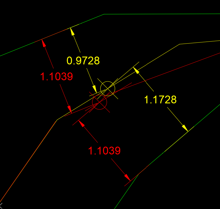[code edited 11/3/2025] I have enjoyed the discussion of this thread. As I gave the task more thought and anaysis it became more clear that the task was not simple. As it appears that there is still no satisfacory solution I thought I would offer the following. The first goal for me was to create a function that would create a midline between two non parallel lines. The mid-lines extents should be a function of the given line segments. This function could then be used in a program that would step through the line segments of one of the polylines and search the other polyline for relevant segments. The function "midline" accepts four points. The first two points, A1 and A2, are the ends of one line sement while the thrid and fourth points, B1 and B2, are the ends of an opposing ilne segments. The diagram below details the variables in the function. The program uses vectors as I prefer them over angles which present, for me, a variety of problems. uA = unit vector in the diection from A1 to A2 uB = unit vector in the direction from B1 to B2 uBisector = unit vector in the direction of the angle bisector of uA and UB The ends of the two lines are projected onto the bisecting line defining 4 points, A1M, A2M, B1M, B2M. I debated which of the points to output for the line to be drawn. I first used the closest and furthest points from the intersecttion point ABIntr but I found it more helpful to use the two intermediate points (A1M and A2M in the example above). Here's an example of the results after manually steppng alone the polyline. Looking at the area circled in red we find: To fill the gap we need a curve that starts with a radius of 0.1514 and ends with a radius of 0.1693. This can be done with a spline or you may find it acceptable to extend the two lines to the point of intersection. The best way to create the spline is to use the Control Vertex Method and use the two endpoints and the imaginary point of intersecton for the middle CV. This ensures tangency to the two lines. As can be seen below the distance to a random point along the spline (red) agree! Run the program "test" and specify the end points of a line segment on one of the polylines, then the endpoints on a line segment on the opposing polyline. I have found the results very accurate and although it may not be used for creating the complete "hybrid " polyline it is helpful in finding the correct line for a specific segment. ;;---------------------------------------------------------------------------- ;; Determines the endpoints of a line the is midway between two lines defined by their end points. ; Input: 4 points, the ends of the first line followed by the ens of the second line ; Output: a list containing the two point of the midline if there's a solution and nil if no solution ; L. Minardi 10/31/2025 - Revised 11/3/2025 (defun midLine (a1 a2 b1 b2 / ua ub p vp d s a1m a2m b1m b2m d1 d2 d3 d4 slist a1p a2p b1p b2p m1 m2 mmid mp) (setq ua (unitVecAB a1 a2) ub (unitVecAB b1 b2) ) (if (< (dot ua ub) 0.0) (setq ub (mapcar '* ub '(-1 -1 -1))) ) (if (> (abs (dot ua ub)) 0.9999) ; are lines parallel? (progn ; lines are parallel (setq p (mapcar '/ (mapcar '+ a1 b1) '(2 2 2)) ; point on midline vp (list (- (cadr ua)) (car ua) 0.0) ; vector perpendicular to ua d (/ (dot (mapcar '- b1 a1) vp) 2.0) ; distance to midline s (dot (mapcar '- a1 p) ua) a1m (mapcar '+ p (mapcar '* ua (list s s s))) s (dot (mapcar '- a2 p) ua) a2m (mapcar '+ p (mapcar '* ua (list s s s))) s (dot (mapcar '- b1 p) ua) b1m (mapcar '+ p (mapcar '* ua (list s s s))) s (dot (mapcar '- b2 p) ua) b2m (mapcar '+ p (mapcar '* ua (list s s s))) d1 0.0 d2 (dot ua (mapcar '- a2m a1m)) d3 (dot ua (mapcar '- b1m a1m)) d4 (dot ua (mapcar '- b2m a1m)) ) (setq slist ; sorted list of distances (vl-sort (list (list a1m d1) (list a2m d2) (list b1m d3) (list b2m d4)) (function (lambda (e1 e2)(< (cadr e1) (cadr e2)))))) ; use the middle two mid point from the line (setq m1 (car (nth 1 slist)) m2 (car (nth 2 slist)) ) (setq mmid (mapcar '/ (mapcar '+ m1 m2) '(2 2 2))) (setq mp (* (dot (mapcar '- a1m mmid) (mapcar '- a2m mmid)))) (if (<= mp 0) (setq theLine (list m1 m2)) (setq theline nil) ) ;;;;; ) ) ; end lines parallel (progn ; lines are not parallel (setq ABIntr (inters A1 A2 B1 B2 nil)) (setq p (mapcar '+ ABIntr (mapcar '/ (mapcar '+ ua ub) '(2 2 2))) ;(setq p (mapcar '+ ABIntr (mapcar '/ (mapcar '+ a1 b1) '(2 2 2))) uBisector (unitVecAB ABIntr p) vp (list (- (cadr ua)) (car ua) 0.0) A1p (mapcar '+ A1 vp) a1m (inters A1 A1P ABIntr p nil) A2p (mapcar '+ A2 vp) a2m (inters A2 A2P ABIntr p nil) vp (list (- (cadr ub)) (car ub) 0.0) B1p (mapcar '+ B1 vp) B1m (inters B1 B1P ABIntr p nil) B2p (mapcar '+ B2 vp) B2m (inters B2 B2P ABIntr p nil) d1 (distance ABIntr a1m) d2 (distance ABIntr a2m) d3 (distance ABIntr b1m) d4 (distance ABIntr b2m) ) (setq slist (vl-sort (list (list a1m d1) (list a2m d2) (list b1m d3) (list b2m d4)) (function (lambda (e1 e2) (< (cadr e1) (cadr e2))))) ) (setq m1 (car (nth 1 slist)) m2 (car (nth 2 slist)) ) (setq mmid (mapcar '/ (mapcar '+ m1 m2) '(2 2 2))) (setq mp (* (dot (mapcar '- a1m mmid) (mapcar '- a2m mmid)))) (if (<= mp 0) (setq theLine (list m1 m2)) (setq theline nil) ) ) ; end lines not parallel ) ; end if ) ; test function (defun c:test ( / a1 a2 b1 b2 mline ) (setq a1 (getpoint "\nEnter start point of first line: ") a2 (getpoint a1 "\nEnter end point of first line: ") b1 (getpoint "\nEnter start point of second line: ") b2 (getpoint b1 "\nEnter end point of second line: ") mline (midline a1 a2 b1 b2) ) (if mline (command "_line" "_non" (car mline) "_non" (cadr mline) "") (princ "\nNo Solution!") ) (princ) ) ; unit vector from point A to point B (defun unitVecAB (A B / x) (setq x (distance A B) x (mapcar '/ (mapcar '- B A) (list x x x)) ) ) ; dot product of vectors A and B (defun dot (A B / x) (setq x (mapcar '* A B)) (setq x (+ (nth 0 x) (nth 1 x) (nth 2 x))) );end of dot mid -poly.06.lsp
