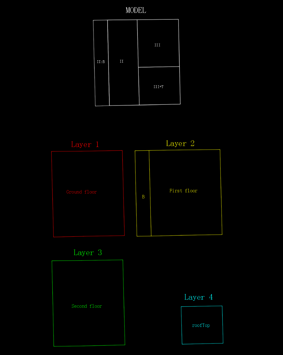 Hi. A simple example. The main label is always a Roman numeral followed by a : or + to indicate, respectively, a floor plan with a particular feature or a number of volumes with another additional element above it. There are many more possible combinations, but I'll stick with a simple example. ctePns.dwg