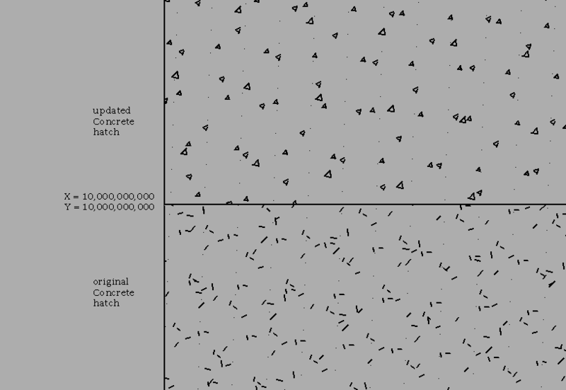 Here is the file definition and a picture of the hatch a long way from the origin. Those able enough can copy the file and overwrite the supplied Concrete Hatch.