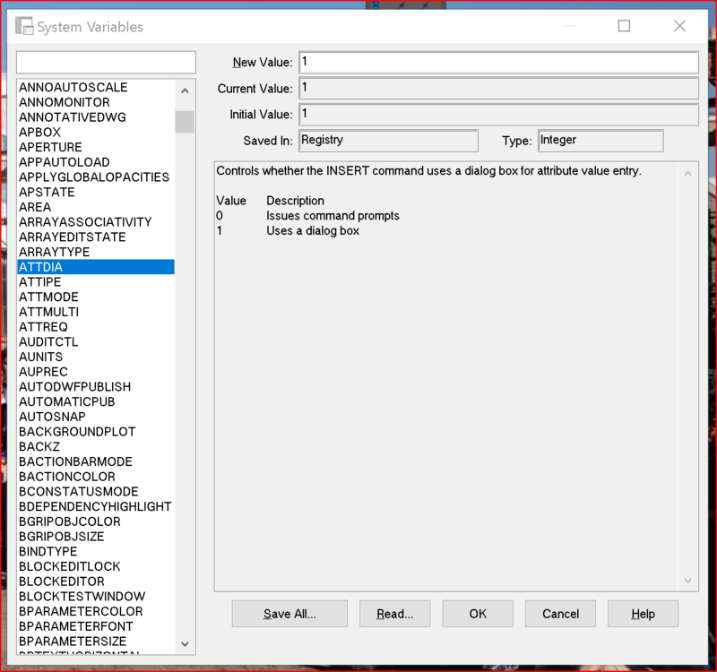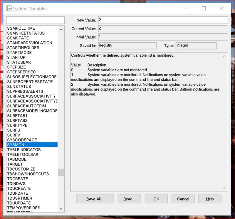 1. @Dana W LT can provide a full list of the system variables using the 'SETVAR' command followed by '?' '*' It is easier to use if you turn on logfiles to get a saved file of the command history and you also need to set 'QAFLAGS=2' to stop the command window from prompting you to press enter affter each screen full of results. I use this often to trace down odd behaviour and quickly check various values (relatively quickly ) you do need to find the logfile and scroll through to the relevant part. It is often easier to close a drawing first and reopen it to start a fresh logfile.
