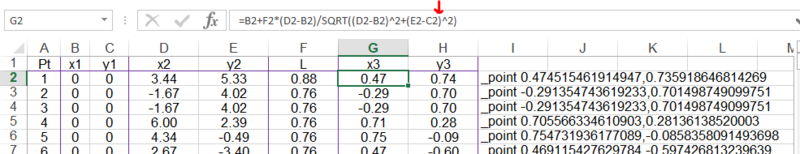 6. @jay@sitetechnologies.io I had a typo in my spreadsheet. Here it is corrected in your Excel file. A similar correction is required in H2 before you fill down. =C2+F2*(E2-C2)/SQRT((D2-B2)^2+(E2-C2)^2) You can copy and pasted the AutoCAD commands in column into the AutoCAD prompt llne to create the points. SolvingPointC.01.xlsx