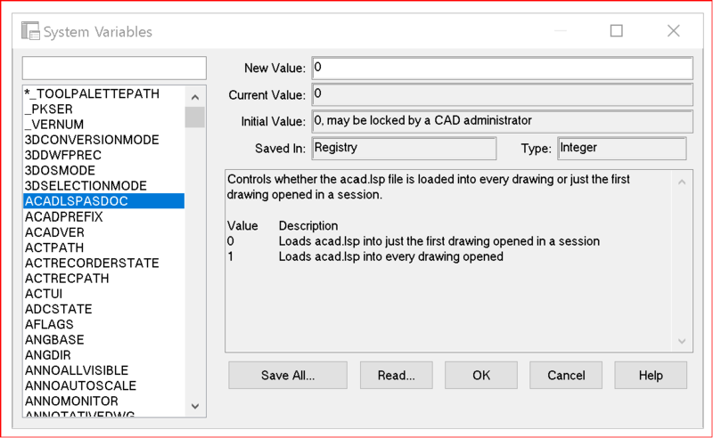 Many elite coders avoid Express Tools because some still have bugs (most easily fixed by replacing "command" calls with "command-s") in them but Help for them has been included in AutoCAD help in recent versions and I've used them since they started out as Bonus Tools. Many of them have been added as regular AutoCAD commands (most of the Layer commands for example), others have been dropped, while others around longer than Bonus Tools like Getsel.lsp and SSX.lsp are still considered Express Tools. Like Dadgad I use SYSVDLG (System Variable Editor…) and ALIASEDIT (Command Alias Editor…) on a regular basis as they provide a quick, simple, and helpful interface that eliminates simple mistakes. While some system variables are persistent, some are saved in the drawing, and some aren't saved at all when a drawing is closed environmental variables are saved in the Windows Registry where they remain unchanged. Keep in mind environmental variables saved in profiles may be different after switching profiles.1 point
