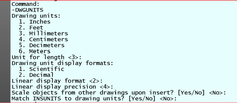 2. Glad to hear that BIGAL and eldon have gotten you back on the tracks. You should explore the -DWGUNITS command, which is quite informative and helpful in such situations. I suggest increasing the commandline history window to about 6 lines, to give you some overview of the conditions in your drawing. I would open a COPY of a file, and play around with it, until you feel you understand the functionality included. READ the commandline prompts very carefully, don't rush, so that you better understand and remember. The numbers displayed <THUSLY> indicate the current settings in your open drawing. For instance Unit for length <3> means that the drawing units are currently set to Millimeters.