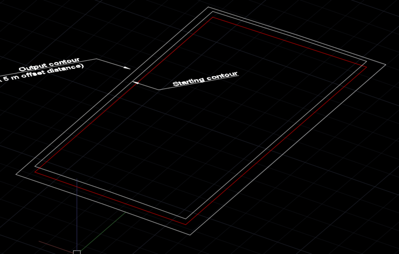 The following process is tedious but will yield the desired result (I think). Working on a new layer create 4 lines snapping to the vertices of the 3dpoly. Move the 4 lines in Z by - 2.5 ( 50% x 5m offset distance). Select one of the lines and use UCS OB to set a ucs for the line. Use Offset with a distance of 5. Repeat steps 3, 4, and 5 for the other edge lines. This will yield the lines shown in green below. Use chamfer to complete the 3D offset.2 points