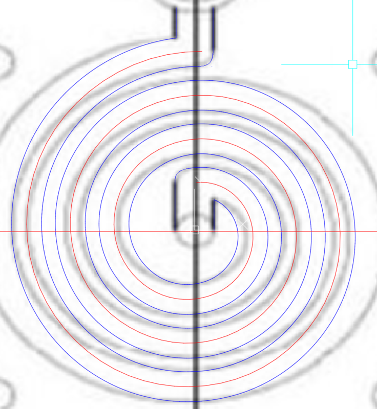 Position the image so that the center is at 0,0 then lock its layer. CReate points above the center to define where the helix should pass. Make sure the helix center is also at 0,0. Create a CW helix of 3 turns. Drag its grips so that it looks like the red helix below.