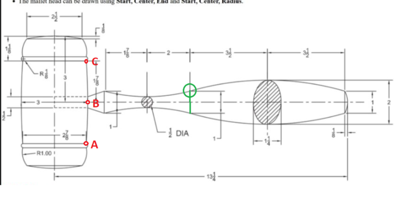 16. The instructions give you most of what you need to know. The ARC command can be used several ways--the method you use depends on the information you have available and where the arc has to go. It may help to draw some construction lines. There's a dashdot line through the center of the mallet, for instance, that you can offset (use the OFFSET command) to get the outer limit of the long arc in the center. By drawing a centerline through the handle, you can create an intersection at the center of each arc and use those to locate the center points. (Hint: use the SNAP filters.) As always, there are multiple strategies for any task in AutoCAD. Find the one that you're most comfortable with.