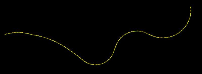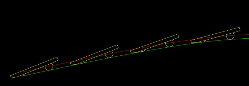 caralign_v11_lrm.dwgHere's an approach that will work if the curve is a spline. The program assumes that the two points of a block that will be required to lie on the spline are the block's base point and a point a known distance (L) on the x axis of the block. The program sets the base point on the spline and then determines then determines the location of the second point on the spline via numerical methods, i.e., it make a series of guesses. The first guess is a distance L along the spline. To use a spline in the sample file caralign_v11.dwg I modified the block named "auto" such that the radius of the two arcs are the same (0.35). The modified block is named "auto-2". Auto-2 The distance between the centers of the arcs was not modified. It is 2.4846. I then created a spline that closely represented the polyline path. The green curve in the image below is that spline. An offset spline (red) is created 0.35 from the "path" spline. The program ArraySpline is then used with a distance of 2.4846. The user may specify the distance between each block instance. In the example below I used 3. The offset curve is used as the path to guarantee that the arcs will be tangent to the original spline. The program could be easily modified to place a block at a specified location on a spline. (defun C:ArraySpline (/ L A blockname path pt smax smax dmax sL more p ang sp dpt ) ; Adds a series of blocks along a spline. The block's origin is placed on the spline. ; The angle of the block is determined by a second point of the block a distance L in the X ; direction of the block. The block's have a user defined spacing of A. ; L. Minardi 8/9/2023 (command "ucs" "w") (setvar 'osmode 0) (setq L (getreal "\nEnter distance between the block's base point and a point on the block's x axis: " ) A (getreal "\nEnter distance to next block: ") blockname (getstring "\nEnter block name: ") ) ;(setq L 1.3 A 1 blockname "block1") ; used for debugging (setq path (car (entsel "\nSelect Path.")) pt (vlax-curve-getStartPoint path) smax (vlax-curve-getEndParam path) dmax (vlax-curve-getDistAtParam path smax) sL (vlax-curve-getParamAtDist path L) more T ; flag for loop ) (while more ; loop for adding blocks until end of spline is reached (setq p (SplinePtAtDist path pt L) ; location on spline for block's second point ang (/ (* (angle pt p) 180.) pi) ) (command "-insert" blockname pt 1 1 ang) (setq dp (vlax-curve-getDistAtPoint path p) ; distance to p sp (vlax-curve-getParamAtPoint path p) ; parameter at p pt (vlax-curve-getPointAtDist path (+ dp A)) ; next block location p (vlax-curve-getPointAtDist path (+ dp A L)) ; initial guess for second point on spline dpt (vlax-curve-getDistAtPoint path pt) ; distance along spline to pt ) (if (< (- sMax sp) sL) ; test if another block will fit on spline (setq more nil) ) ) ; end while (princ) ) (defun SplinePtAtDist (path pt L / disPt p s spt sDelta i sgn err) ; find the point on a spline that is a distance L from the point pt, ; path - spline object name ; pt - known point on the spline that is closer to the beinning of the spline ; than the desired point p that is a straingt line distance L away. ; L - distance between the block's base point and a point on its x axis. (setq disPt (vlax-curve-getDistAtPoint path pt) p (vlax-curve-getPointAtDist path (+ disPt L)) s (vlax-curve-getParamAtPoint path p) spt (vlax-curve-getParamAtPoint path pt) sDelta (/ (- s spt) 3) i 0 sgn 1 ) (while (< i 20) ; sets maximum interations for solution (if (> L (distance pt p)) (progn ; true, L > distance (if (> (* sgn -1) 0) (setq sgn (* sgn -1) ; reverse search diection sDelta (/ sDelta 2); halve the interval search size ) ) ) (progn ; false L not > distance (if (< (* sgn -1) 0) (setq sgn (* sgn -1) sDelta (/ sDelta 2) ) ) ) ) (setq s (+ s (* sgn sDelta)) p (vlax-curve-getPointAtParam path s) ) ;;;(command "point" p) ; used for debugging (setq i (+ i 1)) (setq err (/ (abs (- (distance pt p) L)) L)) (if (< err 0.001) (setq i 100)) ; exit loop if error acceptable ) ; end while (setq p p) ) ; end defun1 point