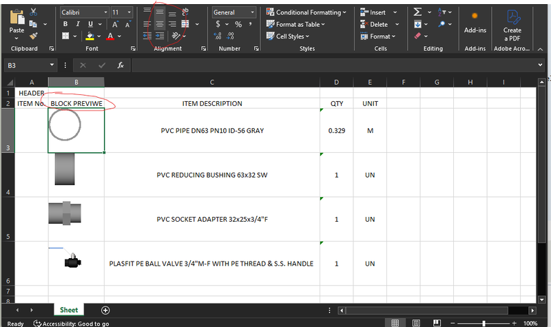 I was only centering the image, this version does all the modified cells You can use AcDbDatabase.getFilename to get the path, then use python’s pathlib (built in) to play with paths from pyrx import Rx, Ge, Gi, Gs, Db, Ap, Ed, Ax import traceback from openpyxl.drawing.image import Image as xlImage from openpyxl.utils.cell import get_column_letter from openpyxl.styles import Alignment import openpyxl as xl import pathlib import wx @Ap.Command() def doit(): try: db = Db.curDb() ps, id, _ = Ed.Editor.entSel("\nSelect a table: ", Db.Table.desc()) if ps != Ed.PromptStatus.eOk: raise RuntimeError("Selection Error! {}: ".format(ps)) #paths xlpath = pathlib.Path(db.getFilename()).parent xlname = pathlib.Path(db.getFilename()).stem wb = xl.Workbook() ws = wb.active table = Db.Table(id) opts = Db.TableIteratorOption.kTableIteratorSkipMerged for cell in table.cells(opts): # format all cells currentCell = ws.cell(cell.row + 1, cell.column + 1) currentCell.alignment = Alignment(horizontal="center", vertical="center") if table.cellType(cell.row, cell.column) == Db.CellType.kBlockCell: blk = table.blockTableRecordId(cell.row, cell.column) img: wx.Image = Gs.Core.getBlockImage(blk, 64, 64, 1.0, [0, 0, 0]) img.SetMaskColour(0, 0, 0) img.SetMask(True) imgpath = "{}/{}.png".format(xlpath, blk.handle()) img.SaveFile(imgpath, wx.BITMAP_TYPE_PNG) xlimg = xlImage(imgpath) xlimg.width = 64 xlimg.height = 64 cellref = "{}{}".format(get_column_letter(cell.column + 1), cell.row + 1) ws.add_image(xlimg, cellref) ws.row_dimensions[cell.row + 1].height = 64 else: ws.cell( row=cell.row + 1, column=cell.column + 1, value=table.textString(cell.row, cell.column), ) wb.save("{}/{}.xlsx".format(xlpath, xlname)) except Exception as err: traceback.print_exception(err) apparently xl has weirdness when it comes to images and alignment with regards to aspect ratio.1 point