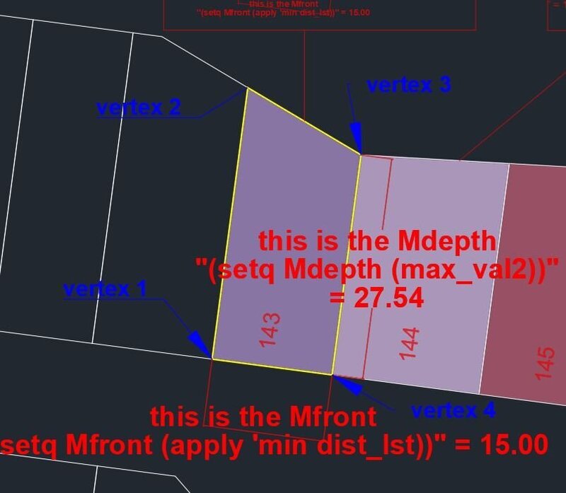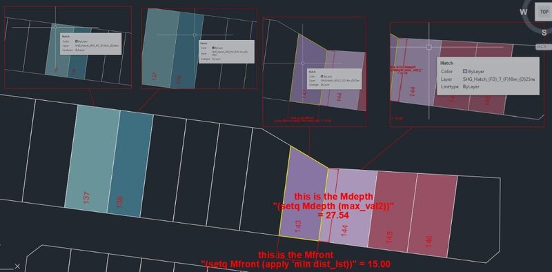 @andyb57J From picture 1 I get thoose layers for parcels. Also, according to your last request, the Mfront will always be the SHORTEST distance between two vertices. From your last request, the Mdepth will always be the SECOND largest number measuring distances between every vertices. Thoose values are stored in dist_lst variable. Description is on the Picture 2. The colors of the hatch is not as yours! Picture 1. Picture 2. This is the last modification from me, for the rest, do it on your own: ;hatch lots based on both Frontage and Depth with RGB colours (prompt "To run a LISP type: hl4") (princ) (defun c:hl4 (/ min_vertices ss len i ent ptlist j dist_lst max_val1 max_val2 min_pt max_pt mid_pt Mfront Mdepth P1 DN DE col lay pt1 pt2 pt3 Mdst colx layx) (setvar "cmdecho" 0) ;;; (setq pt1 (getpoint "\nSelect first frontage point (Right click to exit) : ")) ;;; (if (/= nil pt1)(setq pt2 (getpoint pt1 "\nSelect second frontage point (Right click to exit) : "))) ;;; (if (/= nil pt2)(setq pt3 (getpoint "\nSelect depth point (Right click to exit) : "))) (setq min_vertices 4) (setq min_vertices (getint (strcat "\nEnter the number of vertex to proccessed selection <" (itoa min_vertices) ">:"))) (while (equal min_vertices nil) (prompt "\nThe input value can't be nil! Try again...") (setq min_vertices (getint (strcat "\nEnter the number of vertex to proccessed selection: "))) (princ) ) (prompt "\Select entities for HATCH:") (setq ss (ssget (list (cons 0 "LWPOLYLINE") (cons 70 1) (cons -4 "<=") (cons 90 min_vertices))) ;; use that just to SEE if there are some LWPOLYLINES which are not CLOSED when trying to select entities for HATCHING len (sslength ss) i 0 ) (while ( < i len) (setq ent (ssname ss i) ptlist (mapcar 'cdr (vl-remove-if-not '(lambda (x) (= (car x) 10)) (entget ent))) j 0 dist_lst nil ) (repeat (length ptlist) (if (/= j (- (length ptlist) 1)) (setq dist (distance (nth j ptlist) (nth (1+ j) ptlist)) dist_lst (cons dist dist_lst) j (1+ j) ) (setq dist (distance (nth j ptlist) (nth 0 ptlist)) dist_lst (cons dist dist_lst) ) ) ) (setq dist_lst (vl-sort dist_lst '<) ;;; max_val1 (nth (- (length dist_lst) 1) dist_lst) ;; find the first largest number from dist_lst max_val2 (nth (- (length dist_lst) 2) dist_lst) ;; find the second largest number from dist_lst ) ;;; (setq min_pt (nth 0 (vl-sort ptlist (function (lambda (pt1 pt2) (< (cadr pt1) (cadr pt2)))))) ;;; max_pt (nth (- (length ptlist) 1) (vl-sort ptlist (function (lambda (pt1 pt2) (< (cadr pt1) (cadr pt2)))))) ;;; mid_pt (polar min_pt (angle min_pt max_pt) (/ (distance min_pt max_pt) 2)) ;;; ) ;find frontage ;;; (setq DN (- (cadr Pt2) (cadr Pt1))) ;;; (setq DE (- (car Pt2) (car Pt1))) ;;; (setq Mfront (sqrt(+(* DE DE)(* DN DN)))) ;;; (setq Mfront (distance min_pt max_pt)) (setq Mfront (apply 'min dist_lst)) ;; from dist_lst I find here the min distance between two vertices ;find depth ;;; (setq DN (-(cadr mid_pt) (cadr min_pt))) ;;; (setq DE (-(car mid_pt) (car min_pt))) (setq Mdepth max_val2) ;; sum the max_val1 and max_val2 and divide by 2 (setq col 1) (cond ;Terrace lots < 7.5m frontage - Change TE to TF for front loaded lots and TE to TR for rear loaded terraces. (( <= Mfront 7.49949) (cond ;depth range ((<= Mdepth 24.99949) (setq col "198,110,78" lay "TE_(F)-7.5m_(D)-25m")) ((<= Mdepth 27.99949) (setq col "192,76,54" lay "TE_(F)-7.5m_(D)25m")) ((<= Mdepth 29.99949) (setq col "183,49,44" lay "TE_(F)-7.5m_(D)28m")) ((<= Mdepth 31.99949) (setq col "171,35,40" lay "TE_(F)-7.5m_(D)30m")) ((<= Mdepth 35.99949) (setq col "147,39,44" lay "TE_(F)-7.5m_(D)32m")) (( > Mdepth 35.99949) (setq col "138,42,43" lay "TE_(F)-7.5m_(D)36m")) ) ) ;Terrace Lots 7.5m frontage - Change TE to TF for front loaded lots and TE to TR for rear loaded terraces. ((and(<= Mfront 7.50049 )) (cond ;depth range ((<= Mdepth 24.99949) (setq col "104,101,159" lay "TE_(F)7.5m_(D)-25m")) ((<= Mdepth 27.99949) (setq col "97,94,155" lay "TE_(F)7.5m_(D)25m")) ((<= Mdepth 29.99949) (setq col "86,82,148" lay "TE_(F)7.5m_(D)28m")) ((<= Mdepth 31.99949) (setq col "81,70,137" lay "TE_(F)7.5m_(D)30m")) ((<= Mdepth 35.99949) (setq col "76,65,132" lay "TE_(F)7.5m_(D)32m")) (( > Mdepth 35.99949) (setq col "83,84,74" lay "TE_(F)7.5m_(D)36m")) ) ) ;Terrace Lots between 7.5m and 10.5m frontage - Change TE to TF for front loaded lots and TE to TR for rear loaded terraces. ((<= Mfront 10.49949) (cond ;depth range ((<= Mdepth 24.99949) (setq col "186,187,177" lay "TE_(F)7.5m+_(D)-25m")) ((<= Mdepth 27.99949) (setq col "168,169,158" lay "TE_(F)7.5m+_(D)25m")) ((<= Mdepth 29.99949) (setq col "145,147,136" lay "TE_(F)7.5m+_(D)28m")) ((<= Mdepth 31.99949) (setq col "126,127,116" lay "TE_(F)7.5m+_(D)30m")) ((<= Mdepth 35.99949) (setq col "101,102,92" lay "TE_(F)7.5m+_(D)32m")) (( > Mdepth 35.99949) (setq col "81,83,74" lay "TE_(F)7.5m+_(D)36m")) ) ) ;Standard Lots between 10.5m and 12.5m frontage ((<= Mfront 12.49949) (cond ;depth range ((<= Mdepth 24.99949) (setq col "169,133,132" lay "_V_(F)10.5m_(D)-25m")) ((<= Mdepth 27.99949) (setq col "129,107,183" lay "_V_(F)10.5m_(D)25m")) ((<= Mdepth 29.99949) (setq col "138,52,83" lay "_V_(F)10.5m_(D)28m")) ((<= Mdepth 31.99949) (setq col "245,101,83" lay "_V_(F)10.5m_(D)30m")) ((<= Mdepth 35.99949) (setq col "116,72,57" lay "_V_(F)10.5m_(D)32m")) (( > Mdepth 35.99949) (setq col "54,114,142" lay "_V_(F)10.5m_(D)36m")) ) ) ;Standard Lots between 12.5m and 14.0m frontage ((<= Mfront 13.99949) (cond ;depth range ((<= Mdepth 24.99949) (setq col "181,149,148" lay "PV_(F)12.5m_(D)-25m")) ((<= Mdepth 27.99949) (setq col "156,128,199" lay "PV_(F)12.5m_(D)25m")) ((<= Mdepth 29.99949) (setq col "174,72,103" lay "PV_(F)12.5m_(D)28m")) ((<= Mdepth 31.99949) (setq col "245,130,73" lay "PV_(F)12.5m_(D)30m")) ((<= Mdepth 35.99949) (setq col "114,89,71" lay "PV_(F)12.5m_(D)32m")) (( > Mdepth 35.99949) (setq col "73,142,164" lay "PV_(F)12.5m_(D)36m")) ) ) ;Standard Lots between 14.0m and 16.0m frontage ((<= Mfront 15.99949) (cond ;depth range ((<= Mdepth 24.99949) (s