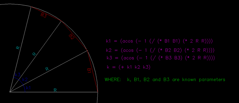 Here is my solution to the multi-chord length problem. We have three unknown subtended angles and three equations. The first equation sums the individual angles: 2*a1 + 2*a2 + a3 = A/2. The angles a1, a2 and a3 are half the subtended arc associated with chord 1, 2 and 3 and A/2 is half the overall angle. The chord length is: Ci = 2*rad*Sin(ai) or the half-chord ci = rad*Sin(ai). Solving for rad = ci / Sin(ai). This is true for each chord since there is only one radius. Therefore c1 / Sin(a1) = c2 / Sin(a2)= c3 / Sin(a3). Taking the first two we get: Sin(a2) = c2*Sin(a1) / c1. This gives us our second equation: a2 = arcsine( c2*Sin(a1) / c1). Our third equation: a3 = arcsine( c3*Sin(a1) / c1). The code solves the three nonlinear equations for the three unknowns by incrementing angle a1 by a very small value and calculating a2 and a3 until equation 1 is more or less zero. The code uses 2*a1 + 2*a2 + a3 - A/2 --> 0. Starting with a small a1 this equation is negative so the solution is when the equation flips to positive. I found that stepping a1 by 0.0000005 provided good results. It takes a second or two to solve on my PC but the value can be adjusted for either more accuracy or faster time. An added feature of this version allows creating either 2, 3, 4 or 5 chords by inputting zero length for chords 2 or 3 or both. C1 must always have a length. Refer to the comments at the top of the lisp code. This code has no error checking. However, if the calculated radius is too large for the selected lines the "fillet" command that draws the arc will throw an error. I know of no way to correct for this since the routine simply creates a multi-faceted "fillet". If you can't draw a radius fillet then you cannot draw a multi-faceted fillet either. You will have to revisit your geometry. I think it works but please let me know if you have problems. ; Routine to add chords of different lengths on an arc tangent to two intersecting lines. ; Routine creates two to five chords of varying lengths symmetrically placed. ; ; Five chords (input three chord lengths): ; Chords 1 - 2 - 3 - 2 - 1 from start to end of arc. ; ; Four chords (input chord 3 length = 0.0): ; Chords 1 - 2 - 2 - 1 from start to end of arc. ; ; Three chords (input chord 2 length = 0.0): ; Chords 1 - 3 - 1 from start to end of arc. ; ; Two chords (input chord 2 and 3 length = 0.0) ; Chords 1 - 1 from start to end of arc. ; ; Routine uses global variables to store the chord lengths. ; ; Reference: ; https://www.cadtutor.net/forum/topic/97799-get-chords-of-two-or-three-different-lengths-on-the-same-arc/ ; +++++++++++++++++++++++++++++++++++++++++++++++++++++++++++++++++++++++++++++++++++++++++++++++++ ; Written: Jerry Fiedler - May 2025 ; LeeMac - asin and entmake code. ; Reinaldo Togores - Prompt for input with default values subroutine. ;++++++++++++++++++++++++++++++++++++++++++++++++++++++++++++++++++++++++++++++++++++++++++++++++++ ; +++++++++++++++++++++++++++++++++++++++++++++++++++++++++++++++++++++++++++++++++++++++++++++++++ (defun c:multichord ( / ent1 ent2 obj1 obj2 p1 p2 p3 p4 apex rad A X C1 C2 C3 end1 end2 arc len ans arcnm pS pE nodes j K1 K2 K3 done arc1 arc2 arc3 lenlst a1 a2 a3) ; Recall stored variables. ; If global variables are undefined set to zero. First time command called. (or *multichordC1* (setq *multichordC1* 0)) (or *multichordC2* (setq *multichordC2* 0.0)) (or *multichordC3* (setq *multichordC3* 0.0)) ; Accept stored values or enter new values. (initget 6) ; No negative values or zero. (setq *multichordC1* (default-value 'getreal "\nEnter length of chord ONE: " *multichordC1*)) (initget 4) ; No negative. (setq *multichordC2* (default-value 'getreal "\nEnter length of chord TWO: " *multichordC2*)) (initget 4) ; No negative. (setq *multichordC3* (default-value 'getreal "\nEnter length of chord THREE: " *multichordC3*)) (setq C1 *multichordC1*) (setq C2 *multichordC2*) (setq C3 *multichordC3*) ; Select lines. (setq ent1 (car (entsel "\nPick Line 1 "))) (setq ent2 (car (entsel "\nPick Line 2 "))) ; Get end points of selected lines. (setq obj1 (vlax-ename->vla-object ent1)) (setq obj2 (vlax-ename->vla-object ent2)) (setq p1 (vlax-get obj1 'startpoint)) (setq p2 (vlax-get obj1 'endpoint)) (setq p3 (vlax-get obj2 'startpoint)) (setq p4 (vlax-get obj2 'endpoint)) ; Calculate the intersection point Line 1 and Line 2. (setq apex (inters p1 p2 p3 p4 nil)) ; Calculate angle A between two lines. (if (equal apex p1 0.01)(setq end1 p2)(setq end1 p1)) (if (equal apex p3 0.01)(setq end2 p4)(setq end2 p3)) (setq X (CALang3P apex end1 end2)) (if (> X 180) (setq X (- 360 A))) (setq X (* pi (/ X 180.0))) (setq A (- pi X)) ; Solve for the three unknown half-angles subtended by each chord, a1, a2 and a3. ; Constants. (setq K1 (/ A 2)) (setq K2 (/ C2 C1)) (setq K3 (/ C3 C1)) ; Step through the three equations using a1 as the index. (setq done t) (setq a1 0.0175) (while done (setq a1 (+ a1 0.0000005)) (if (> a1 1.57) (progn (prompt "\nNo Solution")(setq done nil))) (setq a2 (asin (* (sin a1) K2))) (setq a3 (asin (* (sin a1) K3))) (if (> (+ (* 2 a1) (* 2 a2) a3 (- K1)) 0.0) (setq done nil)) ) (setq rad (/ (/ C1 2) (sin a1))) ; Create arc. (setvar 'filletrad rad) (command "fillet" ent1 ent2) (setq arcnm (entlast)) ; (command "chprop" arcnm "" "_LA" "P" "") (setq arc (vlax-ename->vla-object arcnm)) ; Establish nodes for chords. (setq pS (vlax-get arc 'startpoint)) (setq pE (vlax-get arc 'endpoint)) (setq arc1 (* 2 rad a1) arc2 (* 2 rad a2) arc3 (* 2 rad a3) ) (setq lenlst (list arc1 arc2 arc3 arc2)) (setq j 0) (setq len 0) (repeat 4 (setq len (+ len (nth j lenlst))) (setq nodes (cons (vlax-curve-getpointatdist arc len) nodes)) (setq j (1+ j)) ) (setq nodes (cons pE nodes)) (setq nodes (append nodes (list pS))) ; Create chord pline from list of nodes. ; Entmake code by Lee Mac (McDonnell) Febrary 2010 ; https://www.cadtutor.net/forum/topic/18257-entmake-functions/?tab=comments#comment-149347 (entmake (append (list (cons 0 "LWPOLYLINE") (cons