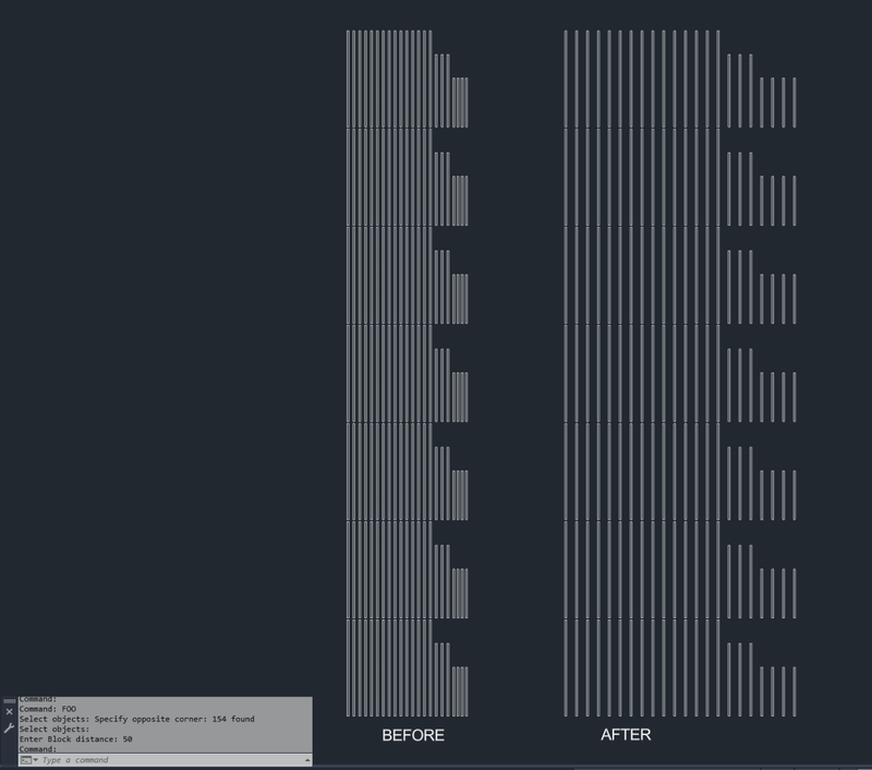(vl-load-com) (defun c:FOO (/ *error* acDoc ss pt y item data blocks) (defun *error* (msg) (if ss (vla-delete ss)) (if acDoc (vla-endundomark acDoc)) (cond ((not msg)) ; Normal exit ((member msg '("Function cancelled" "quit / exit abort"))) ; <esc> or (quit) ((princ (strcat "\n** Error: " msg " ** "))) ; Fatal error, display it ) (princ) ) (if (and (ssget "_:L" '((0 . "INSERT"))) (setq d (getreal "\nEnter Block distance: ")) ) (progn (vla-startundomark (setq acDoc (vla-get-activedocument (vlax-get-acad-object))) ) (vlax-for x (setq ss (vla-get-activeselectionset acDoc)) (setq pt (vlax-get x 'insertionpoint)) (if (setq item (assoc (setq y (cadr pt)) data)) (setq data (subst (cons (car item) (append (cdr item) (list x))) item data) ) (setq data (cons (cons y (list x)) data)) ) ) (if data (foreach item data (setq blocks (vl-sort (cdr item) (function (lambda (a b) (< (car (vlax-get a 'insertionpoint)) (car (vlax-get b 'insertionpoint)) ) ) ) ) ) (setq pt (vlax-get (car blocks) 'insertionpoint)) (foreach block (cdr blocks) (vla-move block (vlax-3d-point (vlax-get block 'insertionpoint)) (vlax-3d-point (setq pt (polar pt 0.0 d))) ) ) ) ) ) ) (*error* nil) ) This works for each group of Blocks at a given Y level, based on the lowest X position in a given row as starting point.1 point