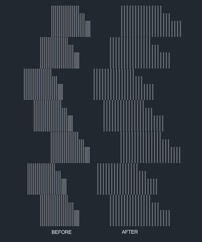 Hi @Tamim, Try with this: (prompt "\nTo run a LISP type: reara") (princ) (defun c:reara ( / old_osmode base_blk spacing ss base_blk_pt dist_blk_lst len i ins_pt dist n dist_n x_cord y_cord new_pt) (setq old_osmode (getvar 'osmode)) (setvar 'osmode 0) (setq base_blk (car (entsel "\nPick the base block:\n")) spacing (getreal "\nEnter the spacing:\n") ) (prompt "\nSelect BLOCK's:") (setq ss (ssget (list (cons 0 "INSERT"))) base_blk_pt (cdr (assoc 10 (entget base_blk))) dist_blk_lst (list) ) (if (ssmemb base_blk ss) (ssdel base_blk ss) ) (setq len (sslength ss) i 0 ) (while (< i len) (setq ins_pt (cdr (assoc 10 (entget (ssname ss i)))) dist (distance base_blk_pt ins_pt) dist_blk_lst (cons (list dist (ssname ss i)) dist_blk_lst) i (1+ i) ) ) (setq dist_blk_lst (vl-sort dist_blk_lst (function (lambda (x1 x2) (< (car x1) (car x2))))) n 0 ) (repeat (length dist_blk_lst) (setq dist_n (- (car (nth n dist_blk_lst)) spacing (* spacing n)) x_cord (- (cadr (assoc 10 (entget (cadr (nth n dist_blk_lst))))) dist_n) y_cord (caddr (assoc 10 (entget (cadr (nth n dist_blk_lst))))) new_pt (list x_cord y_cord) ) (command-s "_move" (cadr (nth n dist_blk_lst)) "" (cdr (assoc 10 (entget (cadr (nth n dist_blk_lst))))) new_pt) (setq n (1+ n)) ) (setvar 'osmode old_osmode) (prompt (strcat "\nThe " (itoa (length dist_blk_lst)) " are rearanged!")) (princ) ) See the following video how it works. Rearange blocks.mp4 Best regards.1 point