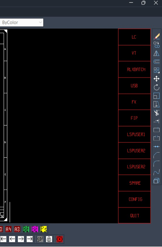 did a little cleaning & tweaking and added a (grdraw) background to give it just a tiny bit more spunk ... enjoy ;;; RlxGrMenu - 2025-07-09 - Just a funny / basic / tiny 'toolbar' ;;; It draws a column on the right of your screen with 12 rows. ;;; Config is not working yet and I'm not sure it's worth the effort because its only meant as a lisp launcher. ;;; Quit by click on QUIT in toolbar or by typing Q , q or space, zoom in / out with +/-/z ;;; I've run a little out of button-space so wanted an out of the box solution to this problem. ;;; this is just a way to run my 10 most used lisp routines, nothing more , nothing less. ;;; Substitute the names in app-list (setq app-list (list "LC" "VT"...) with names from your own favorite apps ;;; Apps (lisps) have to be in search path so (findfile (strcat "MyApp" ".lsp") should work. ;;; Also apps should not be self executing and the start command should be same as app name. ;;; If your app is named "MyApp" this routine loads the app if found and starts it with (eval (read (strcat "C:" "Myapp"))) ;;; have fun ;;; ------------------------------ ;;; ;;; |S1 S2| ;;; ;;; | -------------- ----- [a]| ;;; ;;; | |E1 E2| [b]| ;;; ;;; | | | [c]| ;;; ;;; | | | [d]| ;;; ;;; | |E3 E4| [e]| ;;; ;;; | -------------------- [f]| ;;; ;;; |S3 S4| ;;; ;;; ------------------------------ ;;; ;;; (count_calcula) : run time values for viewsize / viewcenter etc ;;; values are effected by resize window : vc , vs , ss , x+ , x- , y+ , y- , P1-P4 ;;; screen corner points : S1 = (x- y+) , S2 (x+ y+) , S3 (x- y-) , S4 (x+ y-) ;;; extents corner points : E1 - E5 extmin / extmax ;;; viewsize : vs - height current viewport (drawing units) (i.e. 300 / 386 after resize) ;;; screen size : ss (1187 532) (pixels) after max acad window : vs = 386 , ss = (1840 685) ;;; - 12 rows, 1-10 for user , 11 for config , 12 for exit ;;; - height each row = viewsize / 12, row width = 2 x row height ;;; cell-ip = (list (- (fix x+) cell-size) (fix y+)) ;;; vector draw cell-ip -> cell-size<0, (* cell-size 12)<270 , cell-size<180 , (* cell-size 12)<90 (defun draw_menu ( / ip-x ip-y cell-h cell-w cell-ul cell-ll cell-ur cell-lr y-list ctr-x app-list app gr-loop tblc tbtc tbbc start-viewsize) (setq app-list (list "LC" "VT" "RlxBatch" "USB" "FX" "FIP" "LspUser1" "LspUser2" "LspUser2" "Spare" "Config" "Quit")) ;;; toolbar line color / toolbar text color / toolbar background color (setq gr-loop T tblc 7 tbtc 7 tbbc 8) ;;; when zooming in/out it messes up back ground fill so have to compensate for that (setq start-viewsize (getvar "viewsize")) (redraw_menu) ;;; launch app (if app (RlxGrMenu_Start_App app)) ) (defun redraw_menu () (redraw) ;;; get live screen data (count_calcula) (setq cell-h (/ (- y+ y-) 12) cell-w (* cell-h 2)) ;;; corner points (setq cell-ul (list (- x+ cell-w) y+) cell-ur (list x+ y+) cell-ll (list (- x+ cell-w) y-) cell-lr (list x+ y-)) ;;; get y values for all horizontal separators (setq x-list (list (car cell-ll) (car cell-lr)) y-list (gnl- (- (fix y+) cell-h) 11 cell-h)) ;;; fill the backgrounds (setq yy y-) (while (< yy y+) (grdraw (list (car cell-ll) yy) (list (car cell-lr) yy) tbbc) ;;; next y depends on zoom factor (viewsize) , 0.25 is emperical, bigger means bigger linespacing (setq yy (+ yy (* 0.25 (/ (getvar "viewsize") start-viewsize)))) ) ;;; draw the outlines (grdraw cell-ll cell-ul tblc)(grdraw cell-ul cell-ur tblc)(grdraw cell-ur cell-lr tblc)(grdraw cell-lr cell-ll tblc) ;;; drawn separators (foreach y y-list (grdraw (list (car cell-ll) y) (list (car cell-lr) y) tblc)) ;;; label the cell (setq ctr-x (+ (car cell-ll) (* cell-w 0.5))) (mapcar '(lambda (s y)(grtxt (strcase s) (list ctr-x (+ y (* cell-h 0.5))) tbtc 0 "M")) app-list (append y-list (list (- (last y-list) cell-h)))) (if gr-loop (RlxGrMenu_Get_Cell_ID x-list y-list)) ) ;;; fill cell with cell background color , use offset of 0.5 unit so outlines remain visible (defun fill_cell (x y w h / x2 y2 w2 h2 x3) (setq x2 (+ x 0.5) y2 (+ y 0.5) w2 (- w 1) h2 (- h 1) x3 (+ x2 w2)) ;(repeat (* (fix h2) 2) (grdraw (list x2 y2) (list x3 y2) tbbc)(setq y2 (+ y2 0.5))) (while (< y2 (cadr cell-ul)) (grdraw (list x2 y2) (list x3 y2) tbbc)(setq y2 (+ y2 0.5))) ) ;;; (re) calculate display parameters (count_calcula) (defun count_calcula () (setq vc (getvar "VIEWCTR") vs (getvar "VIEWSIZE") ss (getvar "SCREENSIZE") dx (* vs (/ (car ss) (cadr ss)) 0.5) dy (* vs 0.5) x- (- (car vc) dx) y- (- (cadr vc) dy) x+ (+ (car vc) dx) y+ (+ (cadr vc) dy) ip (getvar "viewctr") vc-x (car ip) vc-y (cadr ip) txt-h (/ (getvar "VIEWSIZE") 100.0))) ;;; (getvar "extmin") (getvar "extmax") (setq dvx (- x+ x-) dvy (- y+ y-)) (defun screen_res (/ s i is) (setq s (vlax-invoke (vlax-create-object "WbemScripting.SWbemLocator") 'ConnectServer nil nil nil nil nil nil nil) is (vlax-invoke s 'ExecQuery "SELECT CurrentHorizontalResolution, CurrentVerticalResolution FROM Win32_VideoController")) (vlax-for i is (vlax-get i 'CurrentHorizontalResolution))) ;;; generate number (gnum 1 5) -> '(1 2 3 4 5) (defun gnum (s e / i l) (and (numberp s)(numberp e)(setq i s)(while (<= i e)(setq l (cons i l) i (1+ i)))) (reverse l)) ;;; i = startnumber n = number of numbers , d = difference (gnl- 100 6 12) -> (100 88 76 64 52 40) (defun gnl- (i n d / l) (setq l (list i))(repeat (1- n)(setq l (cons (setq i (- i d)) l)))(reverse l)) ;;; found this old lisp (grtxt.lsp) , don't know author but all credits are for this human from earth ;;; text string / coordinate point / color / angle justificationz ;;; *** UPPER CASE ONLY *** (grtxt (STRCASE "Rob") (getvar "viewctr") 1 0 "M") (defun grtxt (ts cp cl a j / vp ltb i xp z c p1 p2 lp ld n al) ;;; vertex points (setq vp '(( 1 ( 0.50 0.25))( 2 ( 0.50 0.55))( 3 ( 0.50 0.85))( 4 ( 0.50 1.00))( 5 ( 0.25 1.00)) ( 6 ( 0.00 1.00))( 7 (-0.25 1.00))( 8 (-0.50 1.00))( 9 (-0.50 0.85))(10 (-0.50 0.55)) (11 (-0.50 0.25))(12 (-0.50 0.10))(13 (-0.25 0.10))(14 ( 0.00 0.10))(15 ( 0.25 0.10)) (16 ( 0.50 0.10))(17 ( 0.50 -0.05))(18 ( 0.50 -0.45))(19 ( 0.50 