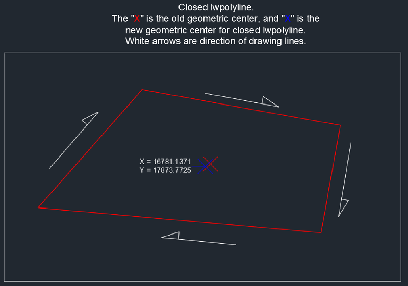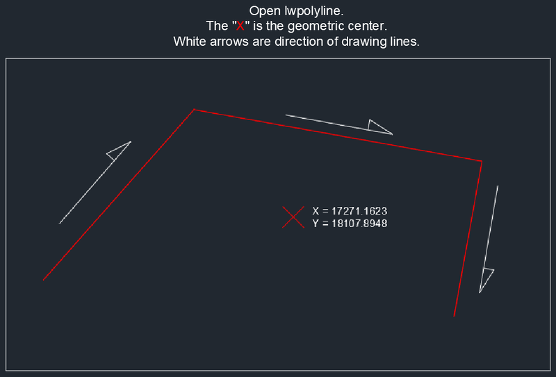 You can actually calculate it, here is the code (you can change it for your purposes): (setq ptlist (mapcar 'cdr (vl-remove-if-not (function (lambda (x) (= (car x) 10))) (setq ent (entget (car (entsel "\nSelect the line:")))))) ;; point list sum_x 0 sum_y 0 vertices (cdr (assoc 90 ent)) ;; number of vertices for LWPOLYLINE ) (foreach pt ptlist (setq sum_x (+ sum_x (car pt))) ;; sum only the X vertices values ) (foreach pt ptlist (setq sum_y (+ sum_y (cadr pt))) ;; sum only the Y vertices values ) (setq sum_x (/ sum_x vertices) ;; dividing the total sum X by the number of vertices sum_y (/ sum_y vertices) ;; dividing the total sum Y by the number of vertices pt (list sum_x sum_y) ;; geometric center ) Below are the pictures with geometric center for open and closed polyline (picture 1 open, picture 2 closed). Picture 1. Picture 2. This is true. Best regards.3 points
