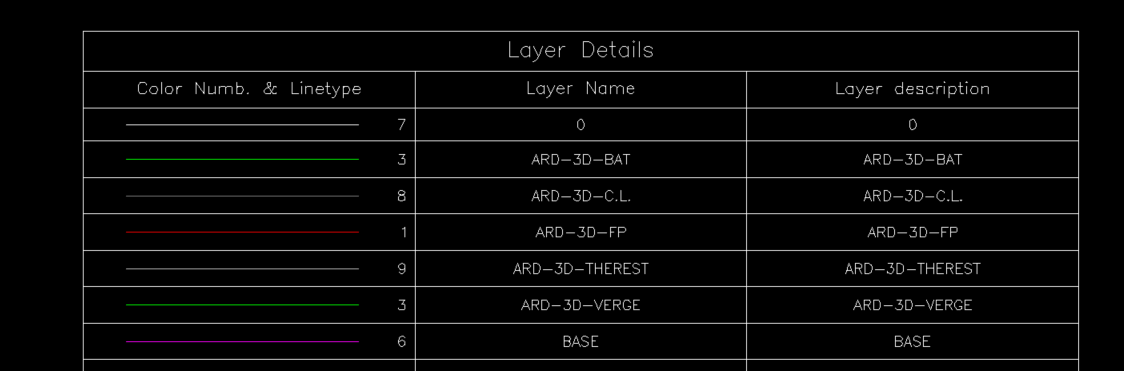 Almost there its a table fixed a couple of bugs and done. Tested on a dwg with 500 layers a little slow takes a few seconds. ; https://www.cadtutor.net/forum/topic/99017-layer-table-lines-and-text/ ; Make a lgend of layers in dwg. ; Bt AlanH March 2026 (defun c:mktablay ( / colwidth doc lay lcol ldesc lname lst numrows objtable oldsnap pt pt1 pt2 rowheight) (defun CreateTableStyle ( / dicts dictobj key class custobj dwglays ) (setq dicts (vla-get-Dictionaries (vla-get-ActiveDocument(vlax-get-acad-object)))) (setq dictObj (vla-Item dicts "acad_tablestyle")) (vlax-for dname dictobj (if (= (vla-get-name dname) "DWGLAYERS" ) ; does it exist (princ "Found DWGLAYERS") (setq dwglays "No") ) ) (if (= dwglays "No") (progn (setq key "DWGLAYERS" class "AcDbTableStyle") (setq custObj (vla-AddObject dictObj key class)) (vla-put-Name custObj "DWGLAYERS") (vla-put-Description custObj "Dwg Index custom table style") (vla-put-BitFlags custObj 1) (vla-put-FlowDirection custObj acTableTopToBottom) (vla-put-HorzCellMargin custObj txtht ) (vla-put-VertCellMargin custObj txtht ) (vla-SetAlignment custObj (+ acDataRow acHeaderRow acTitleRow) acMiddleCenter) (vla-SetTextHeight custObj acDataRow txtht) (vla-SetTextHeight custObj acHeaderRow (* txtht 1.2)) (vla-SetTextHeight custObj acTitleRow (* txtht 1.5)) (vla-SetTextStyle custObj (+ acDataRow acHeaderRow acTitleRow) "Standard") ) ) (princ) ) (setq oldsnap (getvar 'osmode)) (setvar 'osmode 0) (setq txtht 1.5) (CreateTableStyle) (setvar 'ctablestyle "DWGLAYERS") (setq lays (vla-get-layers (vla-get-activedocument (vlax-get-acad-object)))) (setq lst '()) (vlax-for lay lays (setq lname (vlax-get lay 'name)) (setq lcol (vlax-get lay 'color)) (setq ldesc (vlax-get lay 'description)) (setq lst (cons (list lcol lname ldesc) lst)) ) (setq lst (vl-sort lst '(lambda (x y) (< (cadr x)(cadr y))))) (setq pt (vlax-3d-point (getpoint "\npick a point for table "))) (setq doc (vla-get-activedocument (vlax-get-acad-object) )) (if (= (vla-get-activespace doc) 0) (setq curspc (vla-get-paperspace doc)) (setq curspc (vla-get-modelspace doc)) ) (setq numrows 3) (setq numcolumns 3) (setq rowht 5) (setq colwidth 50) (setq objtable (vla-addtable curspc pt numrows numcolumns rowht colwidth)) (vla-settext objtable 0 0 "Layer Details") (vla-settext objtable 1 0 "Color Numb. & Linetype") (vla-settext objtable 1 1 "Layer Name") (vla-settext objtable 1 2 "Layer description") (setq objtable (vlax-ename->vla-object (entlast))) (setq rowht (vla-getrowheight objtable 1)) (vla-put-regeneratetablesuppressed objtable :vlax-true) (setq row 2) (foreach lay lst (princ (cadr lay)) (vla-settext objtable row 0 (strcat (rtos (car lay) 2 0) " ")) (vla-setcellalignment objtable row 0 acMiddleRight) (vla-settext objtable row 1 (cadr lay)) (if (= (caddr lay) "") (setq desc (cadr lay)) (setq desc (caddr lay)) ) (vla-settext objtable row 2 desc) (setq pts (vlax-safearray->list (vlax-variant-value (VLA-GETCELLEXTENTS objtable row 0 :vlax-false)))) (setq pt1 (list (nth 0 pts)(nth 1 pts) 0.0)) (setq pt2 (list (nth 6 pts)(nth 7 pts) 0.0)) (setq vdist (/ (- (cadr pt1) (cadr pt2)) 2.0)) (setq pt1 (mapcar '+ pt1 (list 5.0 (- vdist) 0.0))) (setq pt2 (list (nth 3 pts)(nth 4 pts) 0.0)) (setq pt2 (mapcar '+ pt2 (list (- 7.0) (- vdist) 0.0))) (entmake (list (cons 0 "LINE") (cons 10 pt1) (cons 11 pt2) (cons 8 (cadr lay)))) (vla-insertrows objtable (setq row (1+ row)) rowht 1) ) (vla-put-regeneratetablesuppressed objtable :vlax-false) (setvar 'osmode oldsnap) (princ) ) (c:mktablay)1 point