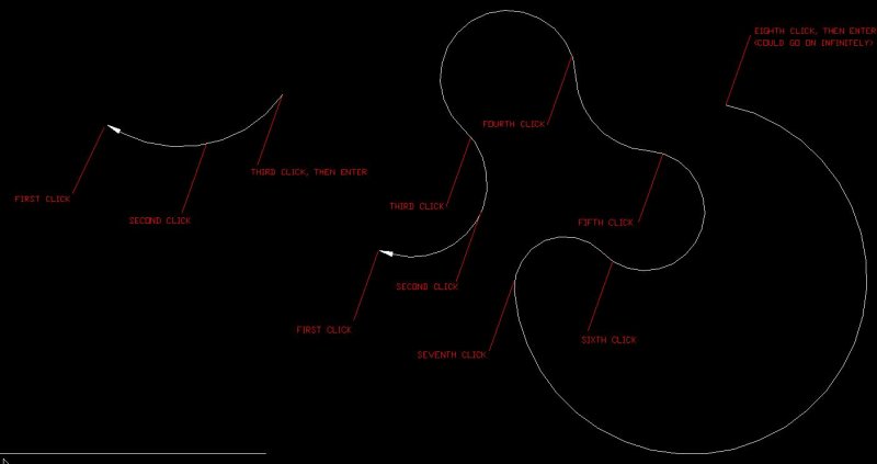 When I used to use R14, I had a customized leader command where the first click was the endpoint of a leader (as usual), the second click was like the midpoint of an arc, and the third click was the other endpoint of an arc. You could continuously keep clicking and producing more arcs connected to the leader block, but typically I would just end the leader there, and it would not end with a text attached to it. Since I upgraded to AutoCAD 2010, the LISP function that I used for that did not transfer over, but I would like to have that again, as the spline leaders that are standard in 2010 look terrible compared to what I used to have, and are nowhere near as versatile. Is there a place I can find a LSP command to do the same thing, or will I have to rewrite the new command again? Here are some examples of how the finished 'CLeader' looked: