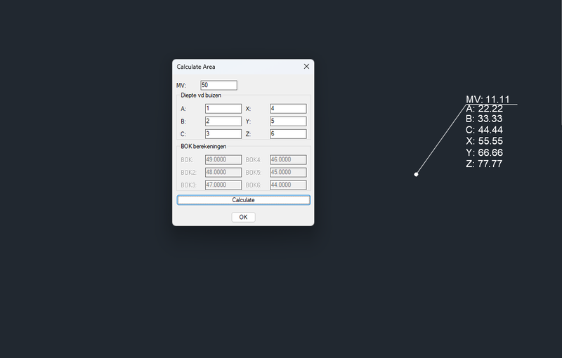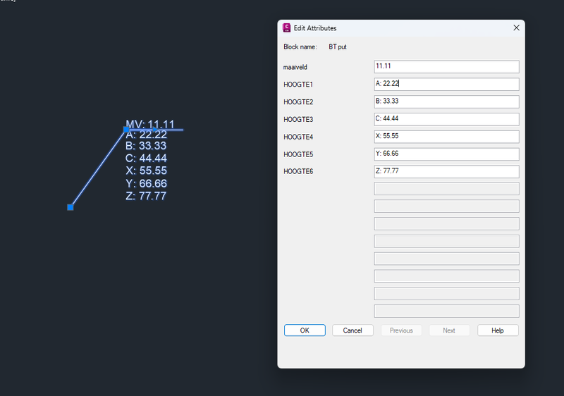 I want to change the values of a dynamic block within a lisp. This lisp contains a calculation. I used .dcl for this. My dynamic block has 7 attributes: maaiveld, HOOGTE1, HOOGTE2, HOOGTE3, HOOGTE4, HOOGTE5 and HOOGTE6. My lisp code has 7 values: m, a, b, c, x, y and z The order of these outputs are important. a, b, and c are sewer pipes that arrive in the cewer, and x, y, and z are pipes that depart from the sewer pit. So if there are only 2 pipes, we only have to use a and x. This makes it difficult. I can't just set HOOGTE1 to a, HOOGTE2 to b, HOOGTE3 to c, etc. If I do it this way, it will leave a gap in my leader. I hope this is even possible. I provided some screenshots of my calculator and of the leader, and the problem of the gap. Maybe I just need to create a more complex dynamic block, so that I can just connect the hoogte1,2,3,... to a,b,c,... I really don't know. code: (defun c:testKRIS ( / *error* dch dcl des mv d1 d2 d3 d4 d5 d6) (defun *error* ( msg ) (if (and (= 'int (type dch)) (< 0 dch)) (unload_dialog dch) ) (if (= 'file (type des)) (close des) ) (if (and (= 'str (type dcl)) (findfile dcl)) (vl-file-delete dcl) ) (if (and msg (not (wcmatch (strcase msg t) "*break,*cancel*,*exit*"))) (princ (strcat "\nError: " msg)) ) (princ) ) (cond ( (not (setq dcl (vl-filename-mktemp nil nil ".dcl") des (open dcl "w") ) ) (princ "\nUnable to open DCL for writing.") ) ( (progn (foreach str '( "ed : edit_box" "{" " alignment = left;" " width = 20;" " edit_width = 10;" " fixed_width = true;" "}" "" "test : dialog" "{" " spacer;" " key = \"dcl\";" " : ed" " {" " key = \"mv\";" " label = \"MV:\";" " }" " :boxed_column { " " label = \"Diepte vd buizen\";" " :row {" " : ed" " {" " key = \"d1\";" " label = \"A:\";" " }" " : ed" " {" " key = \"d4\";" " label = \"X:\";" " }}" " :row {" " : ed" " {" " key = \"d2\";" " label = \"B:\";" " }" " : ed" " {" " key = \"d5\";" " label = \"Y:\";" " }}" " :row {" " : ed" " {" " key = \"d3\";" " label = \"C:\";" " }" " : ed" " {" " key = \"d6\";" " label = \"Z:\";" " }}" " }" " : boxed_row" " { " " label = \"BOK berekeningen\";" " :column {" " : ed { key = \"res\"; label = \"BOK:\"; is_enabled = false; }" " : ed { key = \"res2\"; label = \"BOK2:\"; is_enabled = false; }" " : ed { key = \"res3\"; label = \"BOK3:\"; is_enabled = false; }" " }" " :column{" " : ed { key = \"res4\"; label = \"BOK4:\"; is_enabled = false; }" " : ed { key = \"res5\"; label = \"BOK5:\"; is_enabled = false; }" " : ed { key = \"res6\"; label = \"BOK6:\"; is_enabled = false; }" " }" " }" " : button" " {" " key = \"cal\";" " label = \"Calculate\";" " }" " spacer;" " ok_only;" "}" ) (write-line str des) ) (setq des (close des) dch (load_dialog dcl) ) (<= dch 0) ) (princ "\nUnable to load DCL file.") ) ( (not (new_dialog "test" dch)) (princ "\nUnable to display 'test' dialog.") ) ( t (set_tile "dcl" "Calculate Area") (action_tile "mv" "(setq mv $value)") (action_tile "d1" "(setq d1 $value)") (action_tile "d2" "(setq d2 $value)") (action_tile "d3" "(setq d3 $value)") (action_tile "d4" "(setq d4 $value)") (action_tile "d5" "(setq d5 $value)") (action_tile "d6" "(setq d6 $value)") (action_tile "cal" (vl-prin1-to-string '( (lambda ( / m x y z a b c ) (set_tile "res" "") (set_tile "res2" "") (set_tile "res3" "") (set_tile "res4" "") (set_tile "res5" "") (set_tile "res6" "") (cond ( (or (not mv) (= "" mv)) (alert "Please enter a maaiveld value.") (mode_tile "mv" 2) ) ( (or (not d1) (= "" d1)) (alert "Please enter a A value.") (mode_tile "d1" 2) ) ( (or (not d2) (= "" d2)) (alert "Please enter a B value.") (mode_tile "d2" 2) ) ( (or (not d3) (= "" d3)) (alert "Please enter a C value.") (mode_tile "d3" 2) ) ( (or (not d4) (= "" d4)) (alert "Please enter a X value.") (mode_tile "d4" 2) ) ( (or (not d5) (= "" d5)) (alert "Please enter a Y value.") (mode_tile "d5" 2) ) ( (or (not d6) (= "" d6)) (alert "Please enter a Z value.") (mode_tile "d6" 2) ) ( (not (setq m (distof mv))) (alert "Het Maaiveld moet een getal zijn.") (mode_tile "mv" 2) ) ( (not (setq a (distof d1))) (alert "The A must be numerical.") (mode_tile "d1" 2) ) ( (not (setq b (distof d2))) (alert "The B must be numerical.") (mode_tile "d2" 2) ) ( (not (setq c (distof d3))) (alert "Het C moet een getal zijn.") (mode_tile "d3" 2) ) ( (not (setq x (distof d4))) (alert "The X must be numerical.") (mode_tile "d4" 2) ) ( (not (setq y (distof d5))) (alert "The Y must be numerical.") (mode_tile "d5" 2) ) ( (not (setq z (distof d6))) (alert "The Z must be numerical.") (mode_tile "d6" 2) ) ( (<= m 0.0) (alert "Het maaiveld moet groter dan nul zijn.") (mode_tile "mv" 2) ) ( (<= a 0.0) (alert "The A must be greater than zero.") (mode_tile "d1" 2) ) ( (<= b 0.0) (alert "The B must be greater than zero.") (mode_tile "d2" 2) ) ( (<= c 0.0) (alert "Het C moet groter dan nul zijn.") (mode_tile "d3" 2) ) ( (<= x 0.0) (alert "The X must be greater than zero.") (mode_tile "d4" 2) ) ( (<= y 0.0) (alert "The Y must be greater than zero.") (mode_tile "d5" 2) ) ( (<= z 0.0) (alert "The Z must be greater than zero.") (mode_tile "d6" 2) ) (t (set_tile "res" (rtos (- m a) 2)) (set_tile "res2" (rtos (- m b) 2)) (set_tile "res3" (rtos (- m c) 2)) (set_tile "res4" (rtos (- m x) 2)) (set_tile "res5" (rtos (- m y) 2)) (set_tile "res6" (rtos (- m z) 2)) ) ) ) ) ) ) (start_dialog) ) ) (*error* nil) (princ) ) The code needs work to be visually better, but I want it to work before I do that.- 6 replies