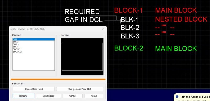 Hi Sir, how to gap betwwen main block and nested block in dcl ;----------------------------------------------- (cond ((null (setq lst (vl-sort lst '<))) (princ "\nNo blocks found in drawing.") ) ((null (and (setq tmp (vl-filename-mktemp nil nil ".dcl")) (setq des (open tmp "w")) (foreach line (list (strcat "blockpreview : dialog { label = \"" datetitle "\";") ;; Title with date-time " spacer;" " : row {" " : boxed_column { label = \"Block List\"; width = 35; fixed_width = true;" " : list_box { key = \"lst\"; height = 15; fixed_height = true; }" " }" " spacer;" " : boxed_column { label = \"Preview\"; width = 35; fixed_width = true;" " : image { key = \"img\"; height = 15; fixed_height = true; }" " }" " }" " spacer;" " : image { color = 30; width = 50; height = 0.5; alignment = centered; }" ;; Orange line " spacer;" " : boxed_column { label = \"Block Tools\";" ;; Single box around ALL buttons " : row {" " : button { key = \"cbp_btn\"; label = \"Change Base Point\"; }" " : button { key = \"cbpr_btn\"; label = \"Change Base Point (Ref)\"; }" " }" " spacer;" " : row {" " : button { key = \"rename_btn\"; label = \"Rename\"; is_default = true; }" " : button { key = \"select_btn\"; label = \"Select Block\"; }" " : button { key = \"cancel\"; label = \"Cancel\"; is_cancel = true; }" " : button { key = \"about\"; label = \"About\"; }" " }" " }" " spacer;" " : text { label = \"Author: XYZ | https://abcd.com/\"; alignment = centered; }" "}" ) (write-line line des) ) (not (setq des (close des))) (< 0 (setq dcl (load_dialog tmp))) (new_dialog "blockpreview" dcl) ) ) (princ "\nUnable to load dialog.") ) ;------------------------------------------------