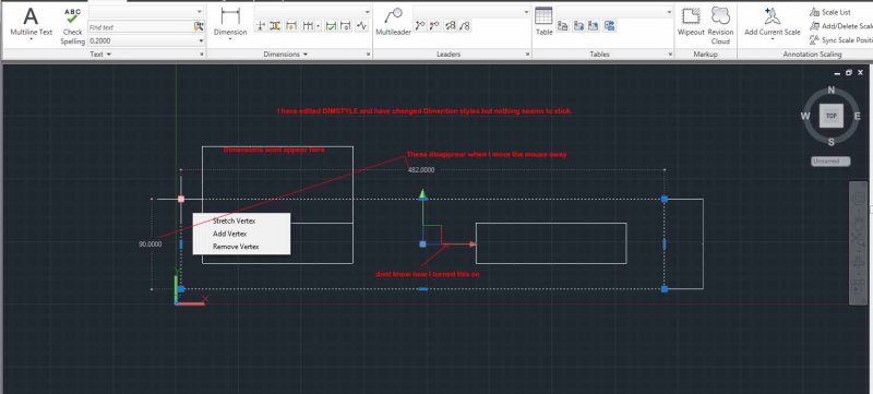 This used to work, then my computer dies and AutoCad was reinstalled. I am trying to dimension some cut-outs in a 19" rack panel. I can dimension them, it shows the correct dimensions but then when I hit enter it wont save the dimensions. I've gone into DIMSTYLE and everything looks fine but I cant get this simple task to work. Any help would be much appreciated.