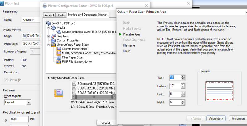 Hi guys, This one has been giving me some headache. Could anyone of you point me into the right direction, I'd be most thankful. Software used: ZWCAD2014 on a Windows 10 machines. For those who may not know about ZWCAD: it is an actual and legal clone of AutoCAD 2012 official purchased at dealer store, the software is created by ZWSOFT. Just think of it as AutoCAD 2012, it makes understanding easier :-). In our company we have 8 workstation using the same ZWCAD program We only plot / publish from the layout tabs We all use DWG to PDF as it came with the software The created PDF's are send by email or they get plotted on our printer/plotter for internal use So far so good... but the problem is when I create an A3 (for example but it is the same on any paper size) it plots normal to a good looking PDF. If the same DWG is opened by one of my collegues, the plot gets cropped off, there are parts missing. I have attached the example output. I know fore sure some of us (me including) have tried to change the plottable area ages ago, reason for that was that the "default DWG to PDF" had way to big of a non printable area. To be in short: my DWG plots good on my workstation, and my collegues DWG plot okay on his workstation. But between all of the workstation it all gets messed up. We cannot plot each others drawings to PDF without having problems with the plottable area. I thought, let me check all the settings in the driver (see attachement) and I have put them all the same on another workstation. It did not change at all. At last I tried copying my PC5 file to the collegues.... still nothing changes. Now I can only think of a complete "re-install" of the software in order to get them working the same all the same once again. Before uninstalling and reinstalling the ZWCAD program and it's utilities, I'd thought maybe I'd ask here if someone could help me out. Thanks for the help!- 5 replies