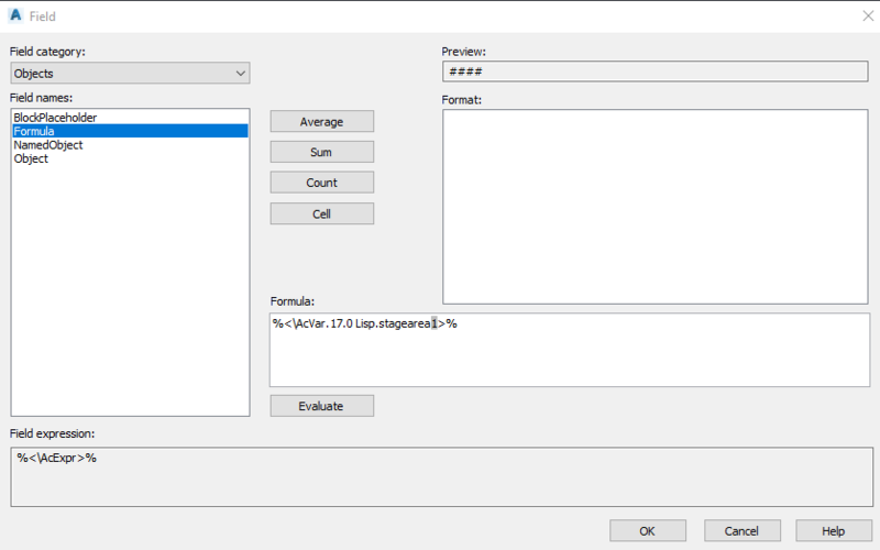 Hey Guys, I have created a bunch of lisp variables that look something like this "StageArea1", "StageArea2", ect What im wanting to do is create a field formula that links to these variable, but i want whatever area value it calls to be determined by the contents of a piece of text. My initial thoughts where something like this(or some variation of it): %<\AcVar.17.0 Lisp.StageArea(%<\AcObjProp Object(%<\_ObjId 2228256557344>%).TextString>%)>% With %<\AcObjProp Object(%<\_ObjId 2228256557344>%).TextString>% calling the contents of my piece of text, but this doesn't seem to work when i plug it into a Formula inside the field dialog box. Does anyone have any other ideas on how to do this?- 6 replies