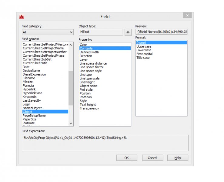 Hi I am trying to get a field to link two texts, so that when the first is edited, the second updates to the same, similar to the =CELL function in excel. I can get this to work when using standard text, however when I try to do this with text that is bold and Arial Narrow, the second text displays lots of additional information. I have attached a screen grab of the field window to show what I mean. How can I avoid this? I am working on AutoCAD LT 2016.