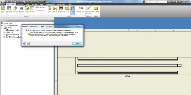G'day, I have a stange inventor problem i am hoping some one can help me with. I am currently running Inventor Professional 2011. The problem occurs when attempting to create a section view, detail view, croping or any other type of view editing command in the .idw drawing. First of all i place my base view, then when i am wanting to section or any of the other i get this error message 'The specified inputs did not create sweep geometry (faces and/or edges). Try by changing path geometry and/or creating the profile on a sketch plane that is perpendicular to the path and contains one of the path vertices.' Now the strange part is that if i reduce the length of the Part i do not get the error message. It seems inventor can not handle very long parts (my part is approximatly 1000 metres long) is there a way that i can create section views/ detail veiws/ crop ? I have attached a screen shot. thanks.