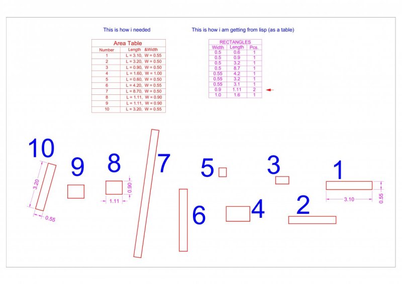 Hai all, i have a lisp that gives me Length and Width of Rectangles that i select into a Table in cad. the table gives me the length and width as per incremental in size (eg:{ 1x2, 1.2x2, 2.1x3 } like wise) i have attached a screenshot of this, and also joins same size rectangle in one cell and shows number as 2. What i need help is to get the table not as incremental values but as i select (1st selection in first cell, 2nd in second cell like that). Please check the Screen shot. i don't know how to change the codes, the lisp is from a friend i got. so please help if possible , thanks in advance.. Please check the image ive uploaded too. the lisp code: (defun rectangle_dims (e / l a b) (setq l (mapcar 'cdr (vl-remove-if '(lambda (x) (/= (car x) 10)) e))) (if (and (or (= 1 (logand (cdr (assoc 70 e)) 1)) (equal (car l) (last l) 1e-8) ) (equal (distance (car l) (caddr l)) (distance (cadr l) (cadddr l)) 1e-8) (equal (mapcar '- (cadr l) (car l)) (mapcar '- (caddr l) (cadddr l)) 1e-8) (equal (mapcar '- (caddr l) (cadr l)) (mapcar '- (cadddr l) (car l)) 1e-8) ) (vl-sort (list (distance (car l) (cadr l)) (distance (cadr l) (caddr l))) '<) ) ) (defun C:RECDIMS (/ acObj acDoc space *error* ss e old r p1) (vl-load-com) (setq acObj (vlax-get-acad-object) acDoc (vla-get-activedocument acObj) space (vlax-get acDoc (if (= 1 (getvar 'cvport)) 'PaperSpace 'ModelSpace)) ) (vla-startundomark acDoc) ;;;;;; Error function ;;;;;;;;; (defun *error* (msg) (and msg (not (wcmatch (strcase msg) "*CANCEL*,*QUIT*,*BREAK*")) (princ (strcat "\nError: " msg)) ) (vla-endundomark acDoc) (princ) ) ;;;;;;;;;;;;;;;;;;;;;;;;;;;;;;; (if (setq ss (ssget '((0 . "LWPOLYLINE") (-4 . "<OR") (90 . 4) (90 . 5) (-4 . "OR>")))) (progn (repeat (setq i (sslength ss)) (setq e (ssname ss (setq i (1- i)))) (if (setq dims (rectangle_dims (entget e))) (if (setq old (vl-some '(lambda (d) (if (equal (list (cadr d) (caddr d)) dims 1e-8) d)) r)) (setq r (subst (cons (1+ (car old)) dims) old r)) (setq r (cons (cons 1 dims) r)) ) ) ) (if (and r (setq p1 (getpoint "\nSpecify table insert point: "))) (insert_table (mapcar '(lambda (a) (list (cadr a) (caddr a) (car a)) ) (vl-sort (vl-sort r '(lambda (a b) (< (caddr a) (caddr b)))) '(lambda (a b) (< (cadr a) (cadr b)))) ) p1 ) ) ) ) (princ) ) ;;The textheight in table depends on cannonscale (defun insert_table (lst pct / tab row col ht i n) (setq ht (/ 2.5 (getvar 'cannoscalevalue)) pct (trans pct 1 0) n (trans '(1 0 0) 1 0 T) tab (setq tab (vla-addtable space (vlax-3d-point pct) (+ 2 (length lst)) (length (car lst)) (* 2.5 ht) ht)) ) (vlax-put tab 'direction n) (mapcar (function (lambda (rowType) (vla-SetTextStyle tab rowType (getvar 'textstyle)) (vla-SetTextHeight tab rowType ht) ) ) '(2 4 1) ) (vla-put-HorzCellMargin tab (* 0.14 ht)) (vla-put-VertCellMargin tab (* 0.14 ht)) (setq lst (cons '("Width" "Length" "Pcs.") lst)) (setq i 0) (foreach col (apply 'mapcar (cons 'list lst)) (vla-SetColumnWidth tab i (apply 'max (mapcar '(lambda (x) ((lambda (txb) (+ (abs (- (caadr txb) (caar txb))) (* 2.0 ht))) (textbox (list (cons 1 (vl-princ-to-string x)) (cons 7 (getvar 'textstyle)) (cons 40 ht))) ) ) col ) ) ) (setq i (1+ i)) ) (setq lst (cons '("RECTANGLES") lst)) (setq row 0) (foreach r lst (setq col 0) (vla-SetRowHeight tab row (* 1.5 ht)) (foreach c r (vla-SetText tab row col (vl-princ-to-string c)) (setq col (1+ col)) ) (setq row (1+ row)) ) ) (princ "\nType RECDIMS to start the command")