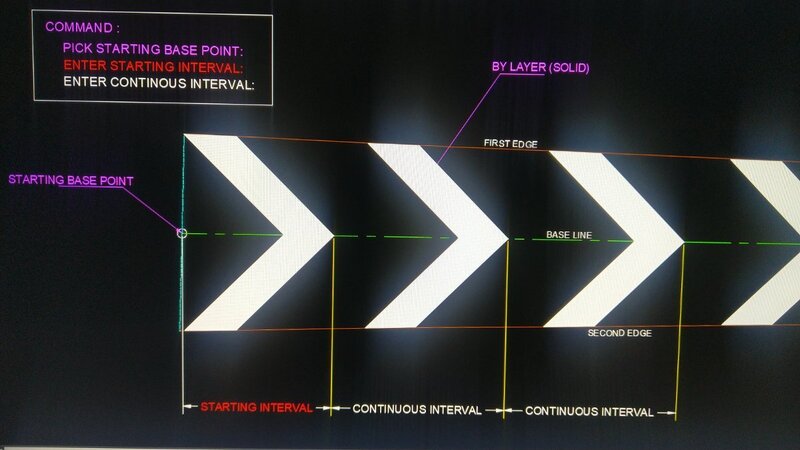 Dear members Can please add Additional code for Road marking chevron starting interval nd fix/continue interval , start base point. By layer, chev solid I will be very thankful to you Thanks Lisp program and image attached CHEVERON MARKING.lsp