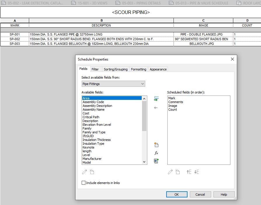 Good Morning. I have been working on setting up a pipe schedule for my current project. Prior to Revit i was using AutoCAD for piping and scheduling which was very tedious. However the pipe schedule format is prefered by our suppliers/contractors and clients and we want to keep the format. i have attached a image for reference (Labeled Example). The AutoCAD schedule was done manually. I have created a relatively automated Revit Schedule, but it needs more refinement and i do not know how to proceed. i have added screen shots to show the schedule i have created. I have used a Tag family to tag the pipe fittings according to my sequence. (This is fine) The comments (description) i have to manually type. (I would like this Automated including the length of the pipe/angle of the elbow/distance the puddle flange is from the flange etc taken from the fitting) The image is a screen shot which is added as a image (this is not ideal , i would like an image that can be dimensioned as in the AutoCAD schedule or as in a window or door legend.) The count is calculated by the number of pipes that have the same tag (This is fine) so this is my goal, and i feel that it should be doable, i just do not know how to go about making it happen. any advice, tips tricks or guidance would be really appreciated