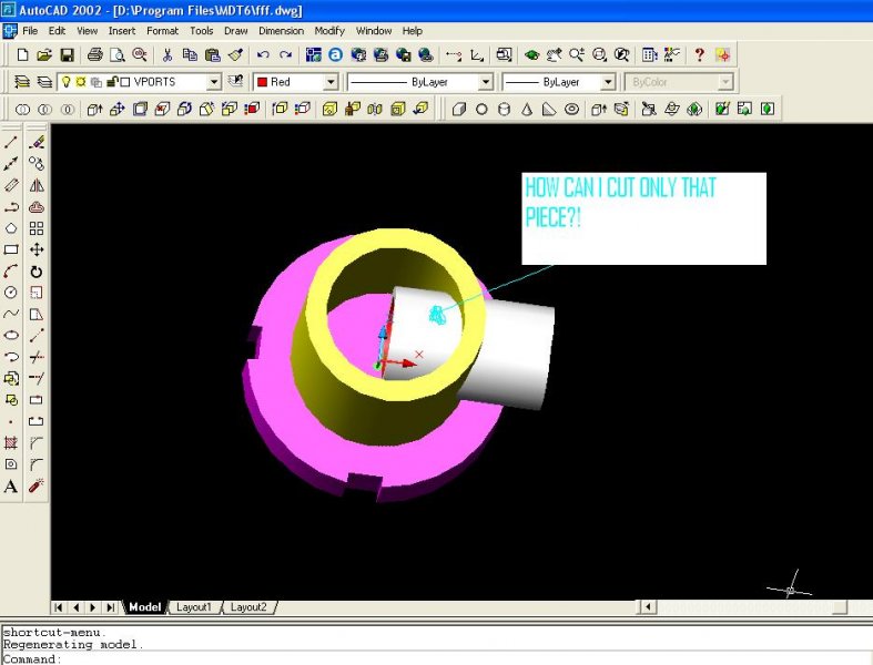 I have a piece to make in autocad 2002 and my work was blocked by a command i dont remember. I am stuck here,how can i cut only that part of the piece? With SUBTRACT doesnt work. i attached the original draw i have to make too. Please help me,if you're so kind fff.dwg
