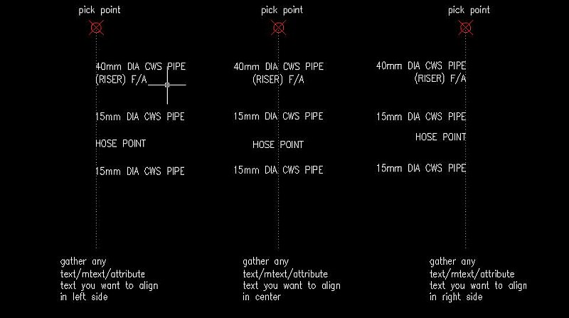 VisDak Posted May 16, 2009 Posted May 16, 2009 Hi Good day to all, is there any body have a route that will arrange and aligned the text/mtext/attribute on any place where i want to pick on sides or middle (as shown on image) By selecting all the text i need to align it on the left or middle or right side so that we will not be able to eye ball it by text alignment. please Thanks to all Quote