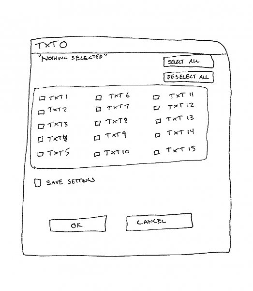 TimSpangler Posted April 1, 2008 Posted April 1, 2008 How's this?? // // TXTO.DCL Version 1.0 // // Copyright© 2007 // // Permission to use, copy, modify, and distribute this software // for any purpose and without fee is hereby granted, provided // that the above copyright notice appears in all copies and // that both that copyright notice and the limited warranty and // restricted rights notice below appear in all supporting // documentation. // // TIMOTHY SPANGLER PROVIDES THIS PROGRAM "AS IS" AND WITH ALL FAULTS. // TIMOTHY SPANGLER SPECIFICALLY DISCLAIMS ANY IMPLIED WARRANTY OF // MERCHANTABILITY OR FITNESS FOR A PARTICULAR USE. DESIGN SOLUTIONS // DOES NOT WARRANT THAT THE OPERATION OF THE PROGRAM WILL BE // UNINTERRUPTED OR ERROR FREE. // // Use, duplication, or disclosure by the U.S. Government is subject to // restrictions set forth in FAR 52.227-19 (Commercial Computer // Software - Restricted Rights) and DFAR 252.227-7013(c)(1)(ii) // (Rights in Technical Data and Computer Software), as applicable. // dcl_settings : default_dcl_settings { audit_level = 0; } txto : dialog { label = "TXTO v1.0"; :column { :row { :text { key = "selected"; width = 30; label = "No text selected"; } :column{ :button{ label = "Select All"; key = "selall"; } :button{ label = "Select None"; key = "selnone"; } } } spacer_0; :boxed_row{ label = "Select text buttons"; :column{ :toggle{ key = "txt1"; label = "TXT1"; } :toggle{ key = "txt2"; label = "TXT2"; } :toggle{ key = "txt3"; label = "TXT3"; } :toggle{ key = "txt4"; label = "TXT4"; } :toggle{ key = "txt5"; label = "TXT5"; } } :column{ :toggle{ key = "txt6"; label = "TXT6"; } :toggle{ key = "txt7"; label = "TXT7"; } :toggle{ key = "txt8"; label = "TXT8"; } :toggle{ key = "txt9"; label = "TXT9"; } :toggle{ key = "txt10"; label = "TXT10"; } } :column{ :toggle{ key = "txt11"; label = "TXT11"; } :toggle{ key = "txt12"; label = "TXT12"; } :toggle{ key = "txt13"; label = "TXT13"; } :toggle{ key = "txt14"; label = "TXT14"; } :toggle{ key = "txt15"; label = "TXT15"; } } } spacer_1; :toggle{ key = "save"; label = "SAVE SETTINGS"; } spacer_1; :image{ key = "sep1"; color = dialog_background; width = 25; height = 1; } spacer_0; ok_cancel; spacer_1; :column{ :paragraph{ :text{ key = "copyright"; label = "--- Copyright© 2008 ---"; alignment = centered; } } } spacer_0; } } Quote