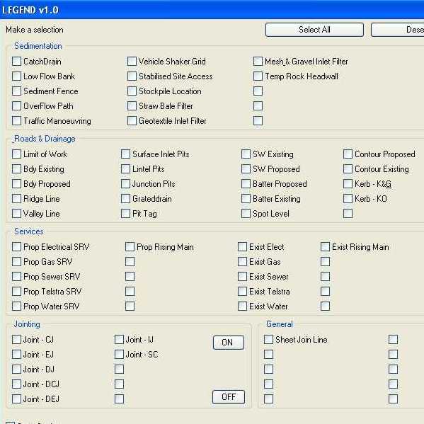 russell84 Posted April 3, 2008 Author Posted April 3, 2008 // // TXTO.DCL Version 1.0 // // Copyright© 2007 // // Permission to use, copy, modify, and distribute this software // for any purpose and without fee is hereby granted, provided // that the above copyright notice appears in all copies and // that both that copyright notice and the limited warranty and // restricted rights notice below appear in all supporting // documentation. // // TIMOTHY SPANGLER PROVIDES THIS PROGRAM "AS IS" AND WITH ALL FAULTS. // TIMOTHY SPANGLER SPECIFICALLY DISCLAIMS ANY IMPLIED WARRANTY OF // MERCHANTABILITY OR FITNESS FOR A PARTICULAR USE. DESIGN SOLUTIONS // DOES NOT WARRANT THAT THE OPERATION OF THE PROGRAM WILL BE // UNINTERRUPTED OR ERROR FREE. // // Use, duplication, or disclosure by the U.S. Government is subject to // restrictions set forth in FAR 52.227-19 (Commercial Computer // Software - Restricted Rights) and DFAR 252.227-7013(c)(1)(ii) // (Rights in Technical Data and Computer Software), as applicable. // dcl_settings : default_dcl_settings { audit_level = 0; } LEGEND : dialog { label = "LEGEND v1.0"; :column { :row { :text { key = "selected"; width = 40; label = "Make a selection"; } :row{ :button{ label = "Select All"; key = "selall"; fixed_width = false; } :button{ label = "Deselect All"; key = "selnone"; fixed_width = false; } } } spacer_0; :boxed_row{ label = " Sedimentation "; :column{ :toggle{ key = "tog1"; label = "CatchDrain"; } :toggle{ key = "tog2"; label = "Low Flow Bank "; } :toggle{ key = "tog3"; label = "Sediment Fence"; } :toggle{ key = "tog4"; label = "OverFlow Path"; } :toggle{ key = "tog5"; label = "Traffic Manoeuvring"; } } :column{ :toggle{ key = "tog6"; label = "Vehicle Shaker Grid"; } :toggle{ key = "tog7"; label = "Stabilised Site Access"; } :toggle{ key = "tog8"; label = "Stockpile Location"; } :toggle{ key = "tog9"; label = "Straw Bale Filter"; } :toggle{ key = "tog10"; label = "Geotextile Inlet Filter "; } } :column{ :toggle{ key = "tog11"; label = "Mesh && Gravel Inlet Filter "; } :toggle{ key = "tog12"; label = "Temp Rock Headwall"; } :toggle{ key = "tog13"; label = ""; } :toggle{ key = "tog14"; label = ""; } :toggle{ key = "tog15"; label = ""; } } :column{ :button{ label = "ON "; key = "selall1"; fixed_width = true; alignment = centered; } :button{ label = "OFF"; key = "selnone1"; fixed_width = true; alignment = centered; } } } :boxed_row{ label = " Roads && Drainage "; :column{ :toggle{ key = "tog31"; label = "Limit of Work "; } :toggle{ key = "tog32"; label = "Bdy Existing"; } :toggle{ key = "tog33"; label = "Bdy Proposed"; } :toggle{ key = "tog34"; label = "Ridge Line"; } :toggle{ key = "tog35"; label = "Valley Line"; } } :column{ :toggle{ key = "tog36"; label = "Surface Inlet Pits "; } :toggle{ key = "tog37"; label = "Lintel Pits"; } :toggle{ key = "tog38"; label = "Junction Pits"; } :toggle{ key = "tog39"; label = "Grateddrain"; } :toggle{ key = "tog40"; label = "Pit Tag"; } } :column{ :toggle{ key = "tog41"; label = "SW Existing "; } :toggle{ key = "tog42"; label = "SW Proposed"; } :toggle{ key = "tog43"; label = "Batter Proposed"; } :toggle{ key = "tog44"; label = "Batter Existing"; } :toggle{ key = "tog45"; label = "Spot Level"; } } :column{ :toggle{ key = "tog46"; label = "Contour Proposed"; } :toggle{ key = "tog47"; label = "Contour Existing"; } :toggle{ key = "tog48"; label = "Kerb - K&&G"; } :toggle{ key = "tog49"; label = "Kerb - KO"; } :toggle{ key = "tog50"; label = ""; } } :column{ fixed_width = true; :button{ label = "ON "; key = "selall2"; fixed_width = true; alignment = centered; } :button{ label = "OFF"; key = "selnone2"; fixed_width = true; alignment = centered; } } } :boxed_row{ label = " Services "; :column{ :toggle{ key = "tog71"; label = "Prop Electrical SRV"; } :toggle{ key = "tog72"; label = "Prop Gas SRV"; } :toggle{ key = "tog73"; label = "Prop Sewer SRV"; } :toggle{ key = "tog74"; label = "Prop Telstra SRV"; } :toggle{ key = "tog75"; label = "Prop Water SRV"; } } :column{ :toggle{ key = "tog76"; label = "Prop Rising Main "; } :toggle{ key = "tog77"; label = ""; } :toggle{ key = "tog78"; label = ""; } :toggle{ key = "tog79"; label = ""; } :toggle{ key = "tog80"; label = ""; } } :column{ :toggle{ key = "tog81"; label = "Exist Elect"; } :toggle{ key = "tog82"; label = "Exist Gas"; } :toggle{ key = "tog83"; label = "Exist Sewer"; } :toggle{ key = "tog84"; label = "Exist Telstra"; } :toggle{ key = "tog85"; label = "Exist Water"; } } :column{ :toggle{ key = "tog86"; label = "Exist Rising Main "; } :toggle{ key = "tog87"; label = ""; } :toggle{ key = "tog88"; label = ""; } :toggle{ key = "tog89"; label = ""; } :toggle{ key = "tog90"; label = ""; } } :column{ fixed_width = true; :button{ label = "ON"; key = "selall3"; fixed_width = true; alignment = centered; } :button{ label = "OFF"; key = "selnone3"; fixed_width = true; alignment = centered; } } } :row{ :boxed_row{ label = " Jointing "; :column{ :toggle{ key = "tog121"; label = "Joint - CJ"; } :toggle{ key = "tog122"; label = "Joint - EJ"; } :toggle{ key = "tog123"; label = "Joint - DJ"; } :toggle{ key = "tog124"; label = "Joint - DCJ"; } :toggle{ key = "tog125"; label = "Joint - DEJ"; } } :column{ :toggle{ key = "tog126"; label = "Joint - IJ"; } :toggle{ key = "tog127"; label = "Joint - SC"; } :toggle{ key = "tog128"; label = ""; } :toggle{ key = "tog129"; label = ""; } :toggle{ key = "tog130"; label = ""; } } :column{ fixed_width = true; :button{ label = "ON "; key = "selall4"; fixed_width = true; alignment = centered; } :button{ label = "OFF"; key = "selnone4"; fixed_width = true; alignment = centered; } } } :boxed_row{ label = " General "; :column{ :toggle{ key = "tog131"; label = "Sheet Join Line"; } :toggle{ key = "tog132"; label = ""; } :toggle{ key = "tog133"; label = ""; } :toggle{ key = "tog134"; label = ""; } :toggle{ key = "tog135"; label = ""; } } :column{ :toggle{ key = "tog136"; label = ""; } :toggle{ key = "tog137"; label = ""; } :toggle{ key = "tog138"; label = ""; } 