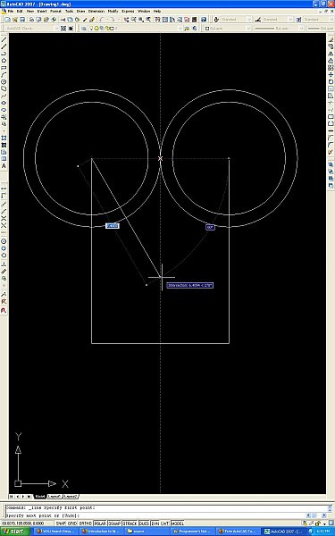 EMUGOD Posted July 18, 2009 Posted July 18, 2009 I am trying to make a new line 7.4 units long, at the proper angle to intercept with the vertical extension of the intercept point of the two circles. It seems like i should be able to type in the length value while the cursor is snapped to the extension to do this, but that doesn't work, instead just taking the current angle and extending as far past the cursor as needed to make the final line 7.4 units long. Is there any way to do this? I have tried zooming in very close and adjusting it manually, which initially seems to work, but causes problems later (a few steps later and pieces built outward some piece will gain a thousandth of a millimeter, a few more additions and one gains a millimeter, etc.). I'm sorry if there is some other term for this and it is a common question, i tried searching but it is a difficult thing to describe and i don't know any technical term for it. Quote