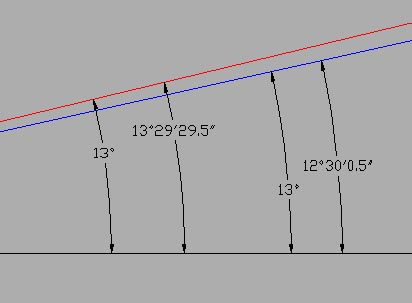 eldon Posted August 10, 2009 Posted August 10, 2009 I think that the basic problem here comes from dimensioning an angle to find out what the angle is, without changing the default settings (nearest degree). In the picture, the red and blue lines are nearly one degree apart, but the dimension shows 13° for each. But if you change the units precision in the dimension style, the more accurate dimensions show what the angles really are. So when using Polar array, always pick the angle if you have not set the lines to an exact angle. Quote
