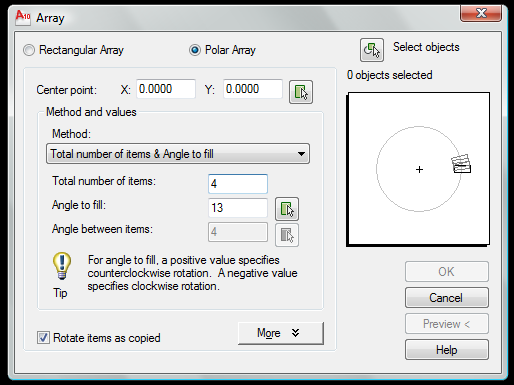 SEANT Posted August 10, 2009 Posted August 10, 2009 In lieu of more complex programming (and AutoCAD LT friendly, though I’m not sure if LT has the ‘CAL command) how about this as a two point option: C^C^_select;\-array;p;;p;\\'cal;ang(@,end,end);; Quote