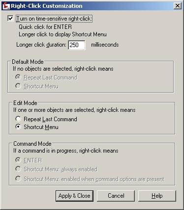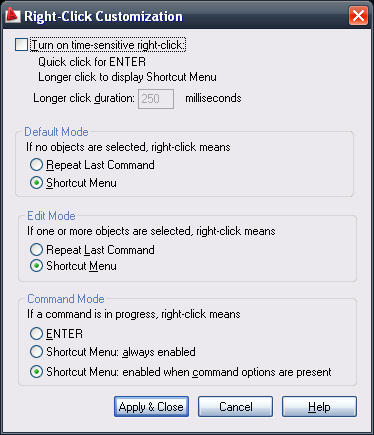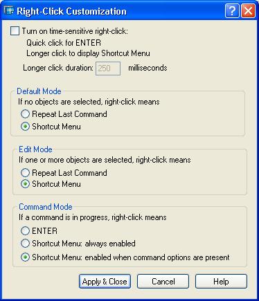 alanjt Posted September 10, 2009 Posted September 10, 2009 Command: (getvar "shortcutmenu")18 Command: These are my settings. If I want the right-click menu to display, I just hold the right button down and it will display. Quote