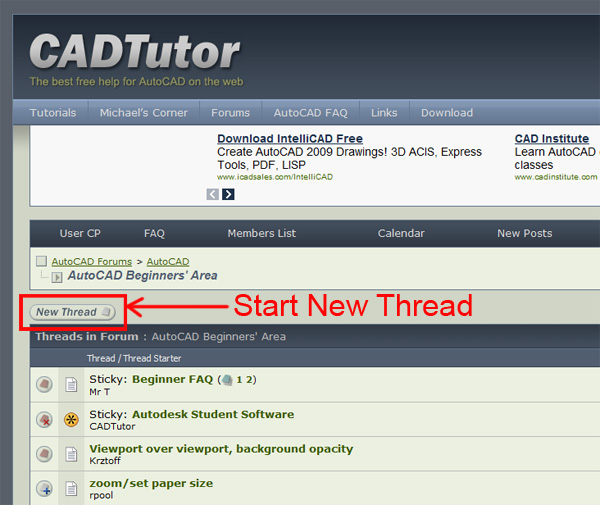 Cad64 Posted November 15, 2009 Posted November 15, 2009 dont really know how to post on this forum...but i really do need someone to guide me thru some stuffs.i am good with most of the commands but the problem is appying them in complex drawings It's simple. If you have a question, just go into any relevant forum and click the "New Thread" button. We prefer that you start a new thread for any questions you have. Please don't tack your question on to the end of someone else's thread. I have moved this question to it's own thread in the Feedback section. Quote