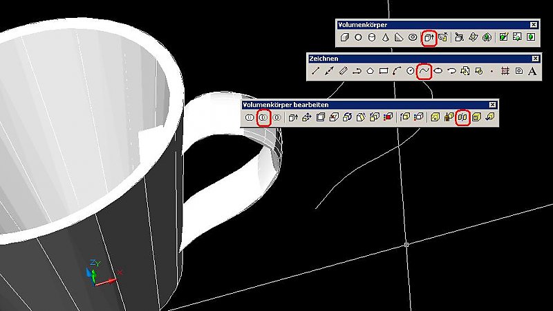 Randolph Posted December 8, 2009 Posted December 8, 2009 Handle: I guess you made your cup creating a 3DSOLID using the ROTATE command from a spline or polyline. Go to side view. Draw a spline according to the shape of the handle. It should intersect with your cup, so that both ends of the spline are well inside the cup. Go to 3D View. Go to WCS (World Coordinate System). Draw a CIRCLE or an ELLIPSE with the center at one end of your spline as the profile of your handle. Don't care for the orientation. Click the EXTRUSION button from the 3D TOOLBOX. Click your CIRCLE. Choose the option [PATH] Click on your SPLINE. You should see your handle now. Use different SHADE MODES. But the ends of the handle are visible inside the cup. COPY the cup without moving. SUBTRACT the cup from the handle. SEPARATE the handle (not sure about the english name of the command - you find it in the MODIFY 3D SOLIDS TOOLBOX. The symbol is '2 little cubes with a dashed line inbetween' next to the button with the broom.) DELETE the inside parts. You're done. Inshallah you'll be succesful. Quote