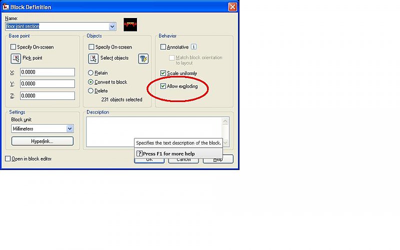 DNK Posted February 16, 2010 Posted February 16, 2010 Enter in the Block command. Find the block name of the block you need to explode. On the right hand side, select the check box next to "Allow Exploding". Click OK. The block can now be exploded. It may also insert that block at 0,0 after redefinition. Quote