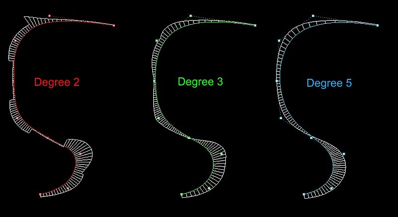 SEANT Posted February 28, 2010 Posted February 28, 2010 As a visual aid for my earlier posting, the image below shows three splines constructed from the same control points.* Each spline has a different Degree (Order), and a Curvature Graph is displayed to show relative curve intensity at that point – the larger the curve graph spike, the tighter the radius. One trait that may not be so obvious (certainly in the Degree 2) is that when the basis function shifts from one set of points to the next, that juncture is tangent. The change in curvature, however, is extremely abrupt. A car in an open parking lot, driving that path shown in the image, serves as a good analogy. In the degree 2, a change in course would require an instantaneous change in steering wheel position – partial left turn immediately to hard right turn. You can imagine how tough that would be on a passenger. The Degree 3 would be like the steering wheel were sent from it’s left turn position to the right turn position at a constant rate – 90 degree steering wheel turn per second, perhaps. I suspect that is how most of us drive. The smoothest drivers, the high price chauffeurs with any luck, would plan each turn in such a way as to slowly accelerate the steering wheel, giving a lot of feedback to the passengers and allow them to brace accordingly. That would be the Degree 5 track. Even though I claim that an analogy, that does come into play with road and rail design. No doubt “banking” the track allows for a higher degree of abruptness without causing as much disruption to passengers. Rates of change in curvature play a huge role in any Aero/Hydrodynamic application where reduction in turbulence is critical. Splines are not necessarily meant for artistic purposes only. * Note: AutoCAD’s native Spline command creates curves based on FitPoints. The Pedit-Spline then Spline-Object sequence of commands is the only available option for ControlPoint driven spline creation. ThreeCurves.dwg Quote
