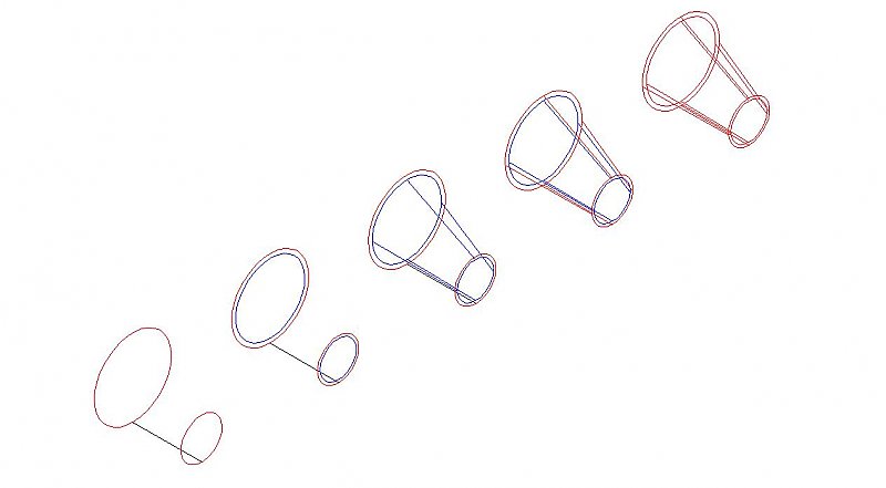 ReMark Posted April 15, 2010 Posted April 15, 2010 A simple eccentric reducer in 3D. The commands used were circle, offset, loft and subtract. Pictured below is a 4x2 eccentric reducer. The color red = O.D. The color blue = I.D. Read from left to right. First set of objects depicts both O.D.'s. Second set of objects we offset for wall thickness to get the I.D.'s. Third set of objects we loft the two I.D.'s. Fourth set of objects we loft the O.D.'s. Fifth set of objects we have subtracted the I.D. from the O.D. Done. Visual style = 2D wireframe. Quote